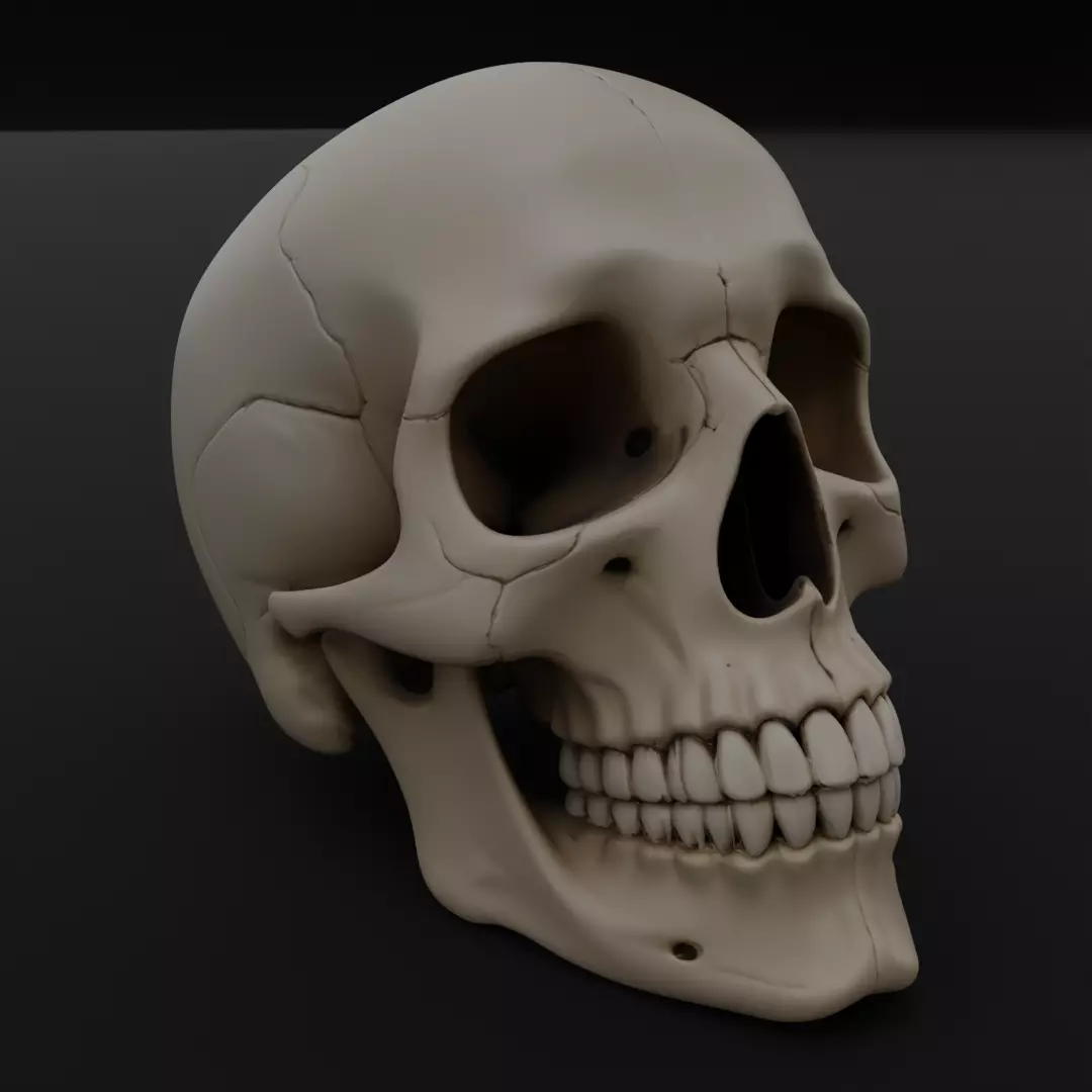 Special attention has been given to print-friendly geometry. The mesh is fully watertight, manifold, and free from errors such as holes, flipped normals, or intersecting faces. All surfaces are optimized to ensure smooth layer transitions and clean results on both FDM and resin 3D printers. Fine details such as teeth, jawline, eye sockets, nasal cavity, and cranial sutures are carefully balanced to remain visible after printing without causing fragile or unprintable areas.