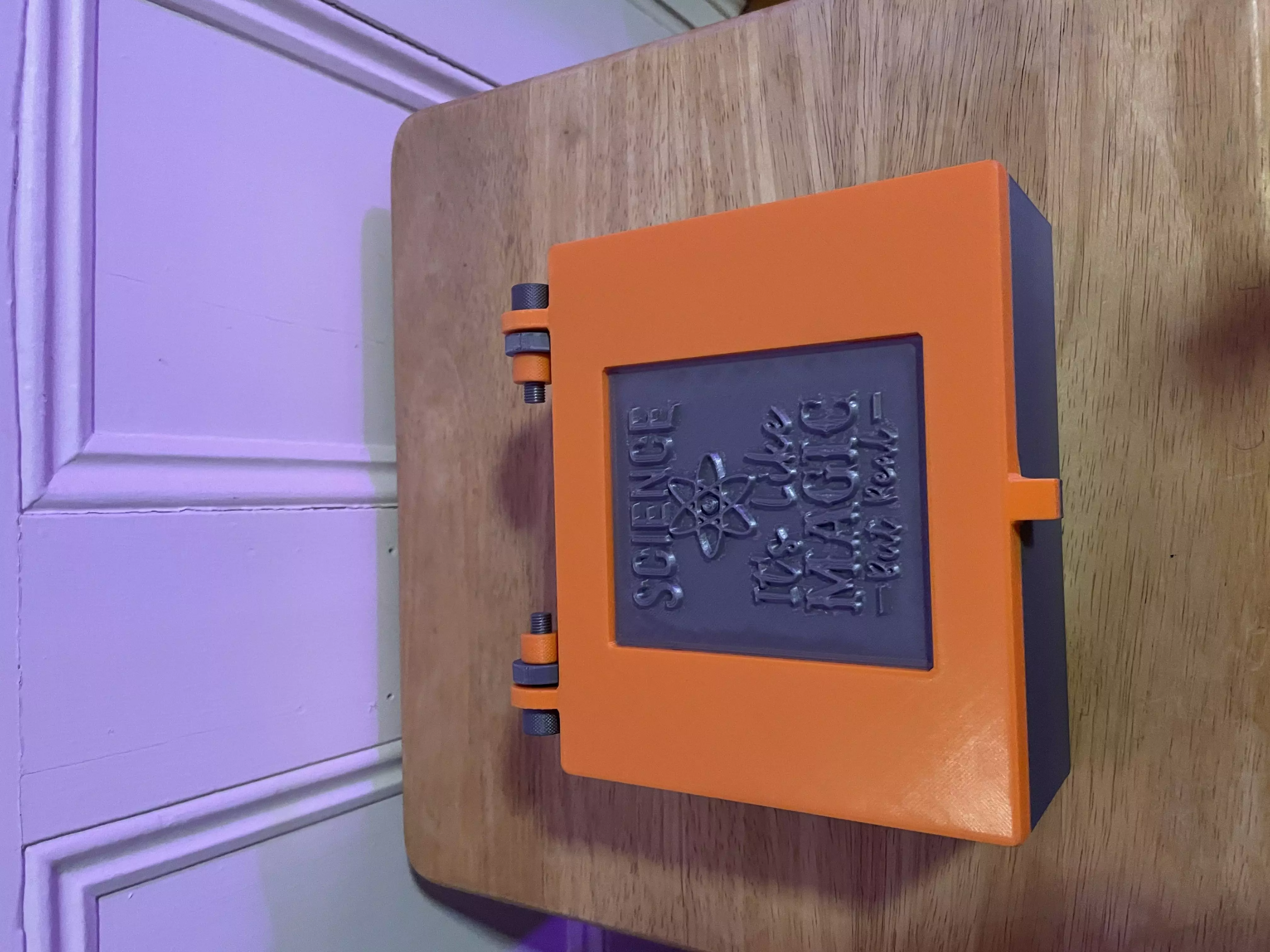 An accessory box I made for my daughter's microscope.I designed it to contain all the microscope accessories for this microscope (https://www.amazon.com/gp/product/B08L7ZKGC8/ref=ox_sc_saved_image_7?smid=A1BIG265MJBW5C&th=1), or anything similar.It keeps all accessories in place inside the box, even while being moved or shaken.The lid is held closed by two round 3mm x 6mm neodymium magnets that are glued in place. You can find them here (https://www.amazon.com/gp/product/B07873ZCY4/ref=ppx_yo_dt_b_asin_image_o04_s00?ie=UTF8&th=1), but any magnets of the same dimensions will work just as well.I have the lid hinges held in place by two 3D printed nuts and bolts that I found free online from akira3dp0 (https://www.thingiverse.com/thing:1460364). I have included a file of the nut and bolt that is sized for the best fit in the microscope box, but you can use any other nuts and bolts that are of an appropriate size for the box (3D printed or otherwise).The Science is like Magic placard is sized for a friction fit on the top of the lid, but depending on your printers tolerance, it may do best glued in place.