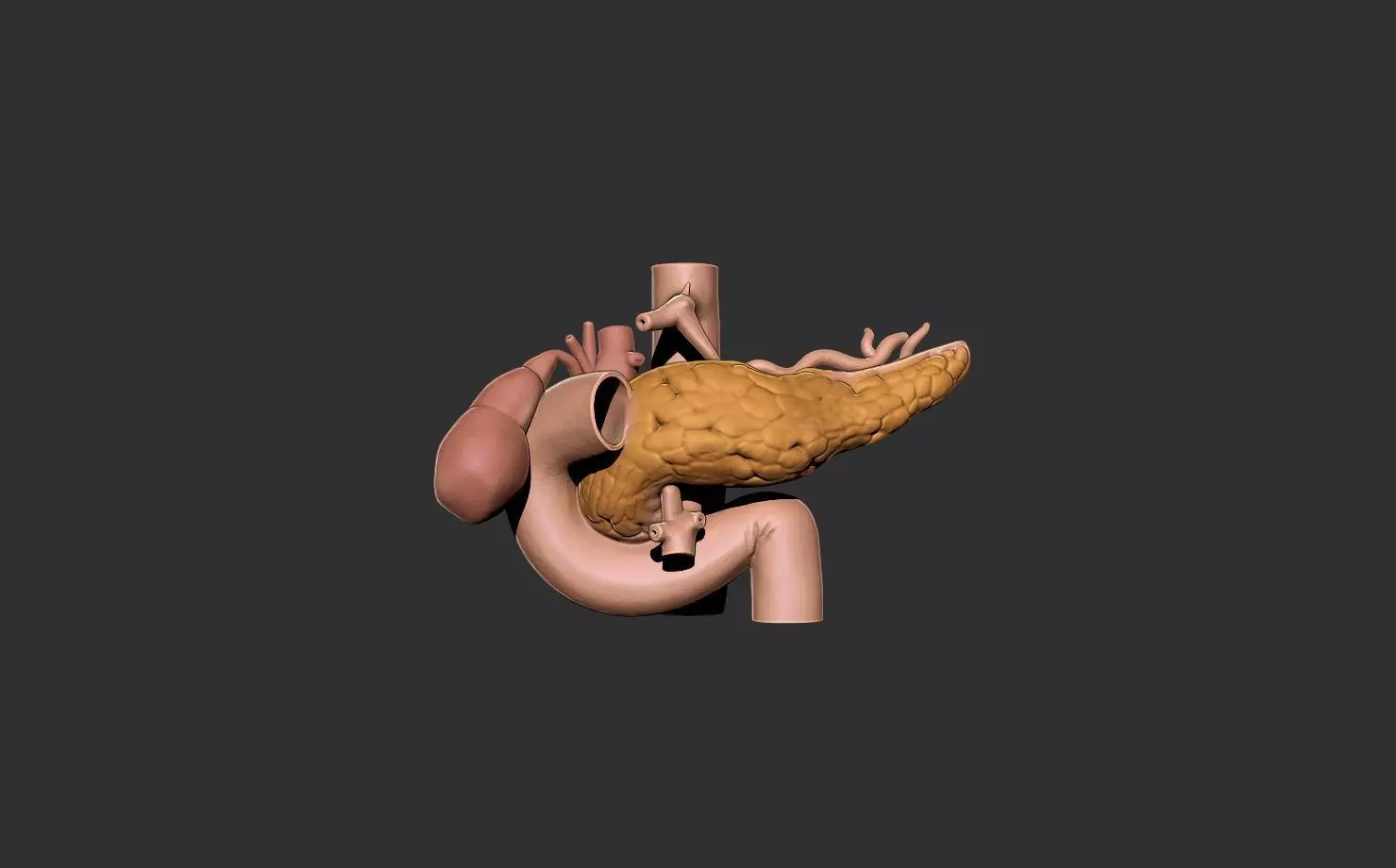 The model features: • Head, body, and tail of the pancreas accurately proportioned. • Pancreatic ducts, including main and accessory ducts. • Positioning relative to adjacent organs, such as the duodenum, stomach, and spleen. • Anatomical proportions consistent with human gastroenterology. • Clean and optimized topology, ready for visualization, simulation, and 3D printing.