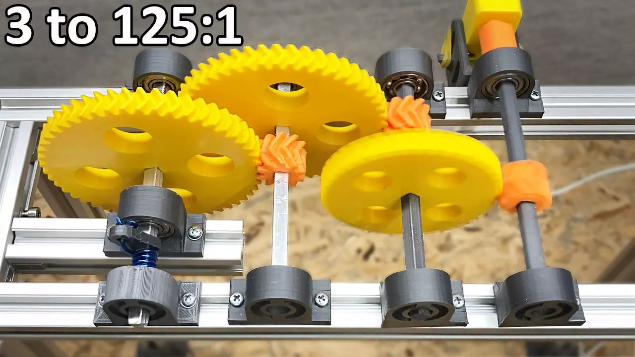 Designed up this modular gearbox on fusion360 and used 20x20 sigma profiles for chassis. Thanks to sigma profiles, you can get the gear ratio you want. Of course between 3...125:1