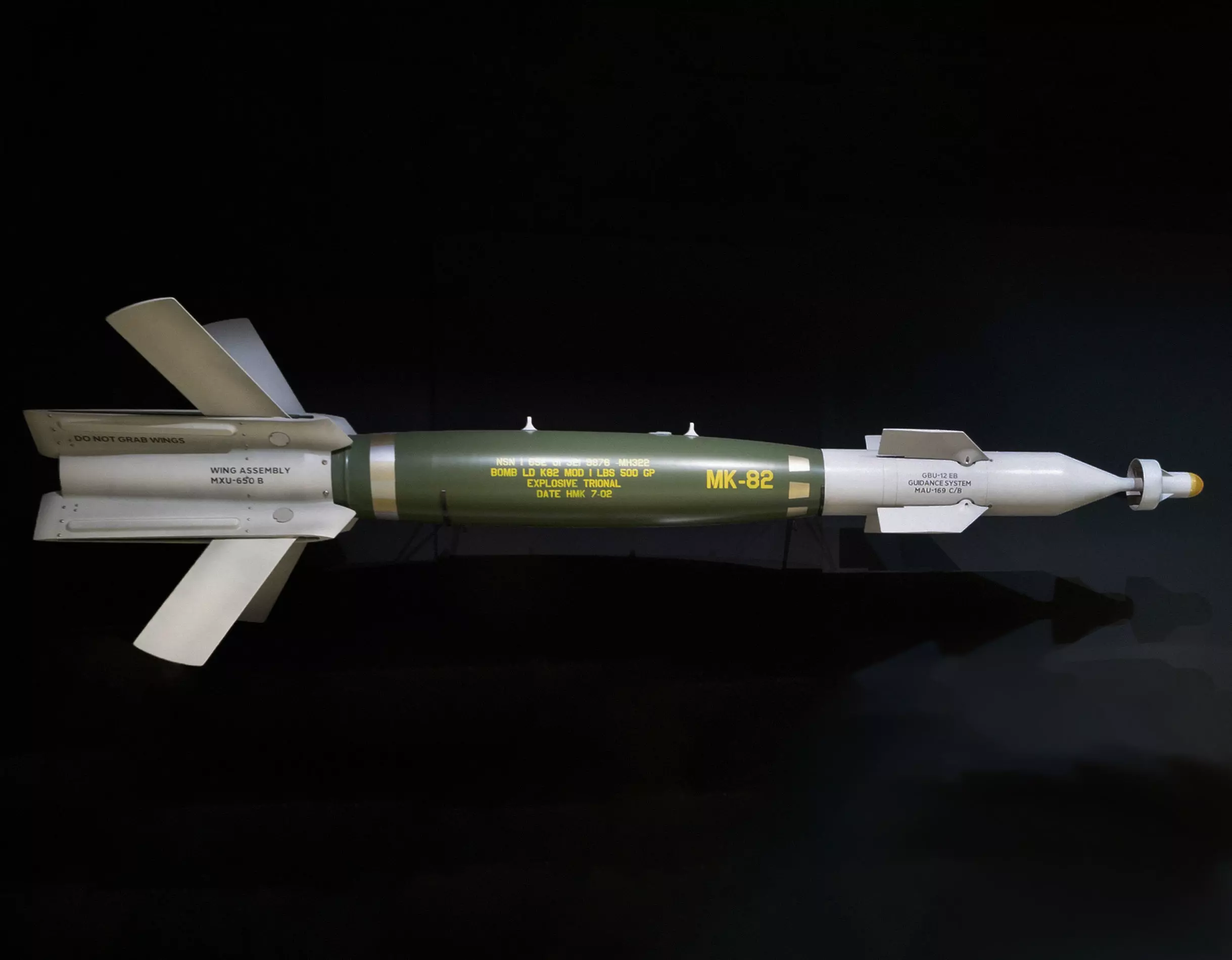 The GBU-12 Paveway II is an American aerial laser-guided bomb, based on the Mk 82 500 lb (230 kg) general-purpose bomb, but with the addition of a nose-mounted laser seeker and fins for guidance. A member of the Paveway series of weapons, Paveway II entered into service c. 1976. It is currently in service with the U.S. Air Force, U.S. Navy, U.S. Marine Corps, and various other air forces. Source Wikipedia