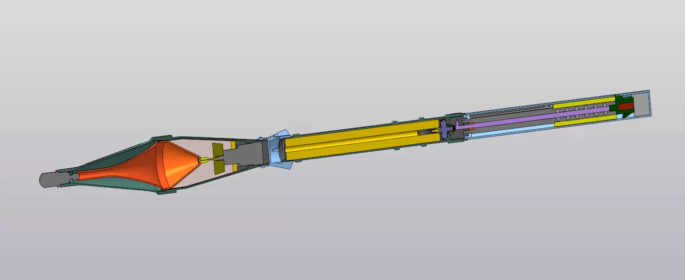 This is the Russian 85mm PG-7 (ПГ-7), a high-explosive anti-tank (HEAT), surface-to-surface, shoulder-launched, spin and fin stabilised rocket incorporating a Point Initiating Base Detonating (PIBD) with self-destruct (SD) fuzing system also made in various countries including Bulgaria and Iraq.The English-language term rocket-propelled grenade, though frequently encountered and reasonably descriptive, is a backronym for RPG (Ruchnoy Protivotankovyy Granatomyot, Hand-held anti-tank grenade launcher) and is not based on a literal translation.On firing, the flash from the percussion cap ignites a small gunpowder charge in the tail section spindle.This ignites the propellant strips surrounding the spindle, kicking the rocket out of the launcher and lighting the tracer.The acceleration is used to initiate the flight motor delay, which ignites the rocket motor after approximately 25m.On launch, the fuze arming sequence commences.
