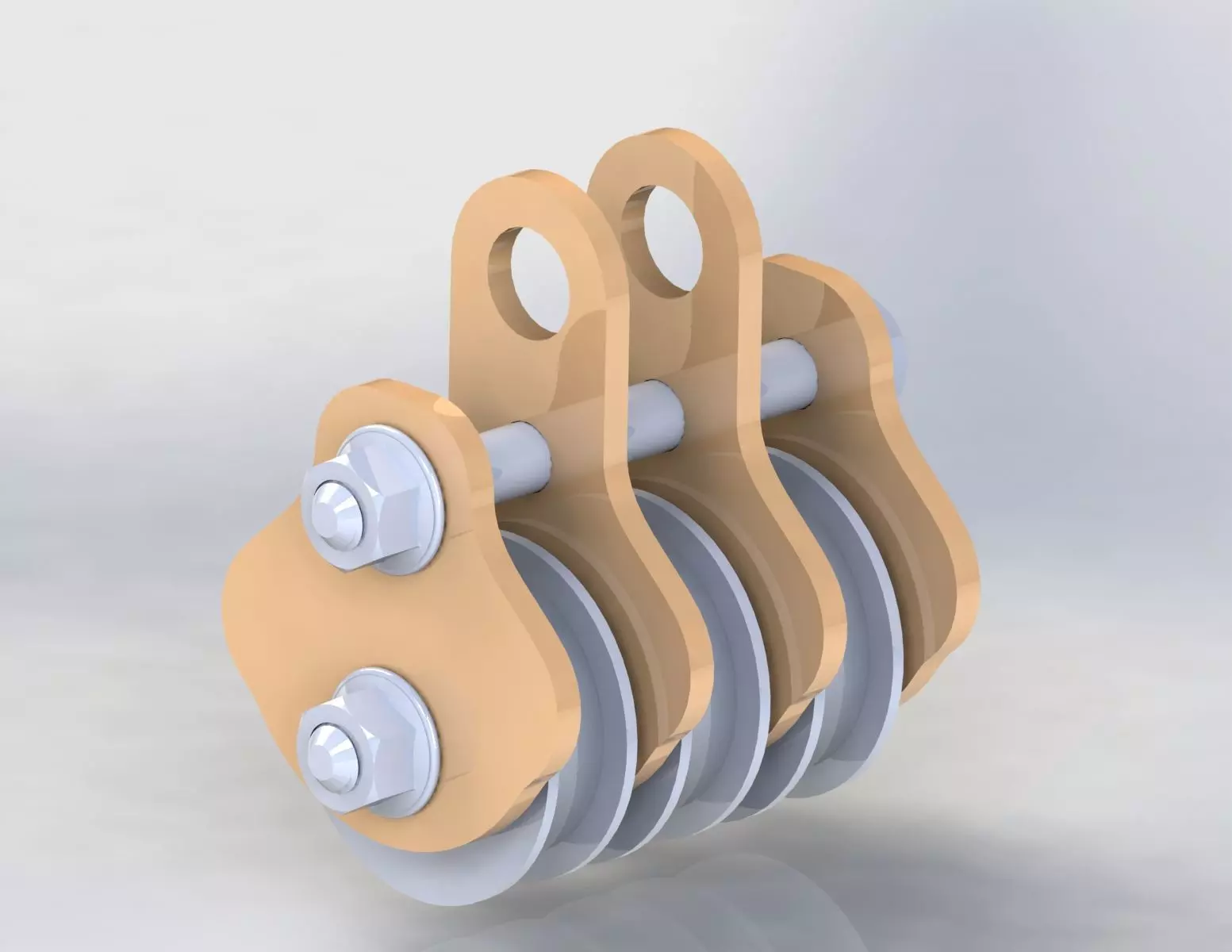 This is a detailed 3D printable mechanical pulley assembly featuring three rollers, designed with an engineering-oriented approach in SolidWorks. The model reflects realistic mechanical proportions and clearances, making it suitable for functional prototyping, educational purposes, or mechanical visualization.