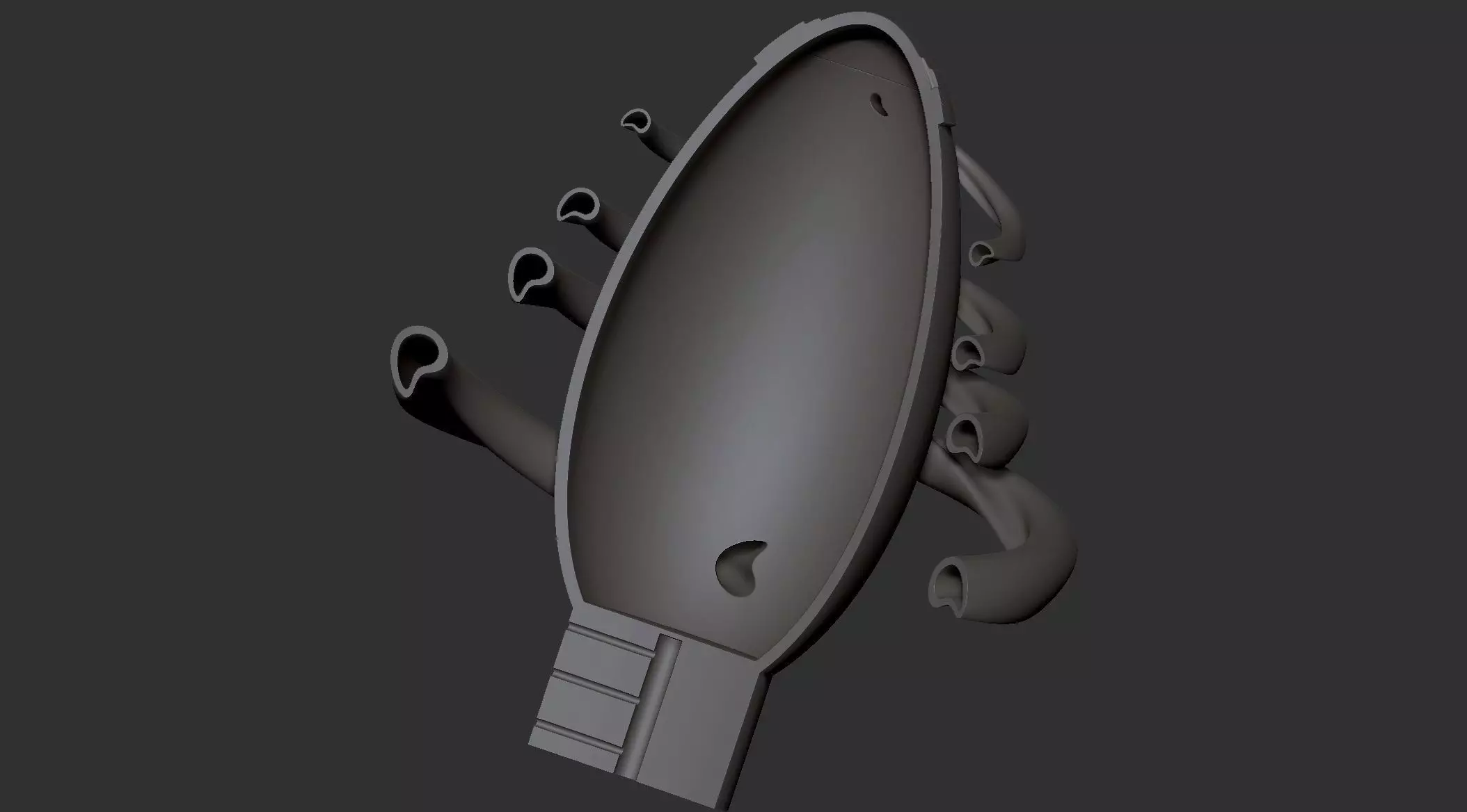 This is a rotating egg with two whorl pipes on the outside. It is balanced and intended for rotation when full of water. This egg shape was exactly derived from the geometry of the pentagram which is a design feature Viktor Schauberger spoke about.
