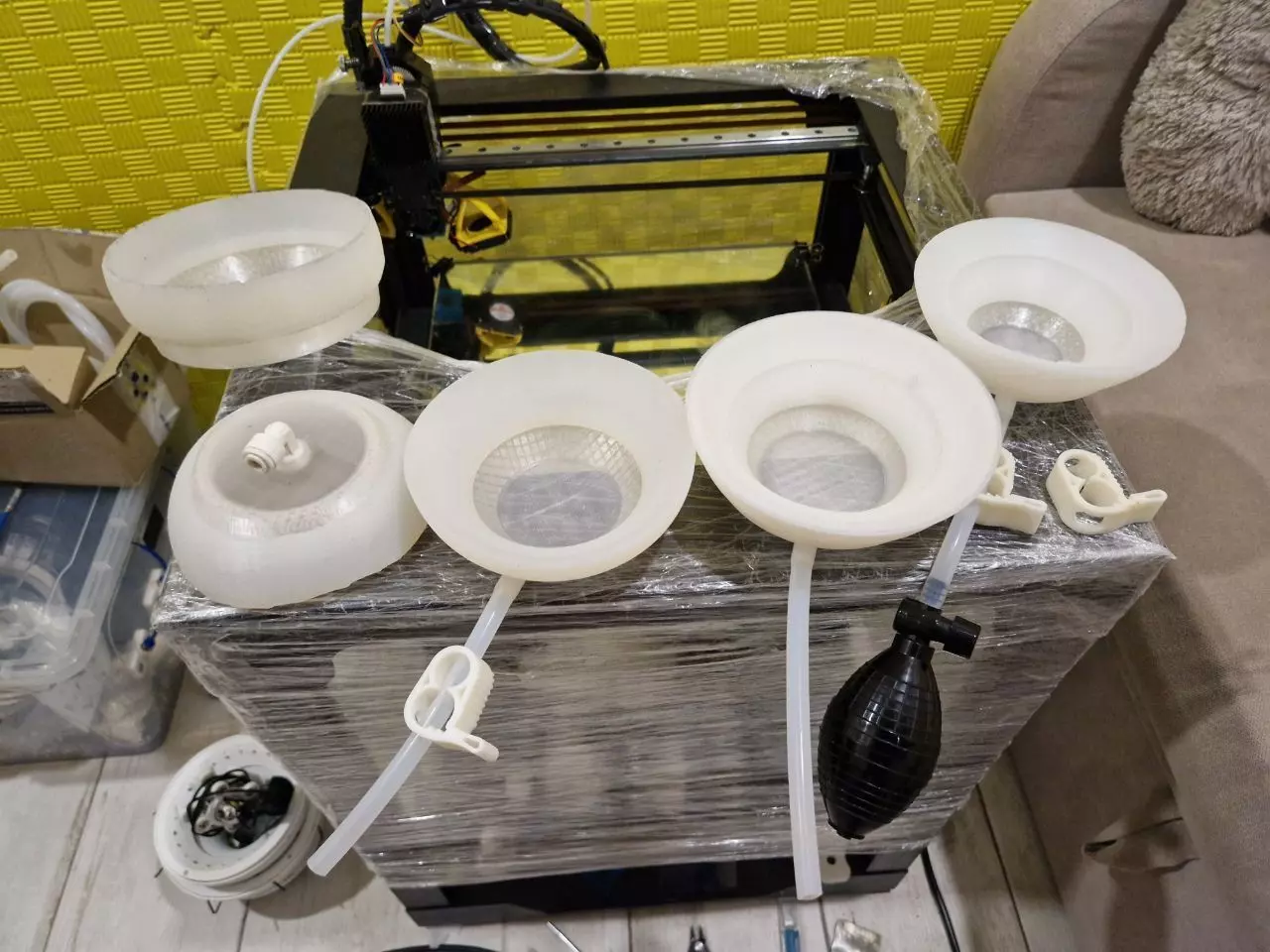 If someone has the desire, time and access to a 3D printer, then I can help with manufacturing, explain how to do it and give files for 3D printing, as well as links to all components in Ukraine (in other countries you will pick up analogues). Now there are tested (passed the manufacturing stage) files for the dome with a contact spot diameter of 70 - 80mm (for a child 4 - 6 years old), 90 - 110mm (7 - 10 years old), 120mm (11 years old), in all domes the diameter of the cuff in working condition is 50-60mm larger, which ensures a smooth fit and soft adjustment vacuum.I dropped some files to Anton, you can ask him for manufacturing technology as well.The shape of the bell did not fit the first time, in the process of improving the fit and holding the vacuum for the vacuum bowl itself, I made some upgrades, as a result, the design itself came out normal, but it requires an individual approach, measurements and restructuring of the model for each case. For girls whose mammary glands have begun to form, I have not yet done options for a dome in the form of an hourglass, but if necessary, we will think together on this issue (there are certain difficulties with the form of holding silicone in analogues, it all sticks together - this is a very expensive pleasure and technology).The cost of the bell in Ukraine came out to be about 25 - 35 euros