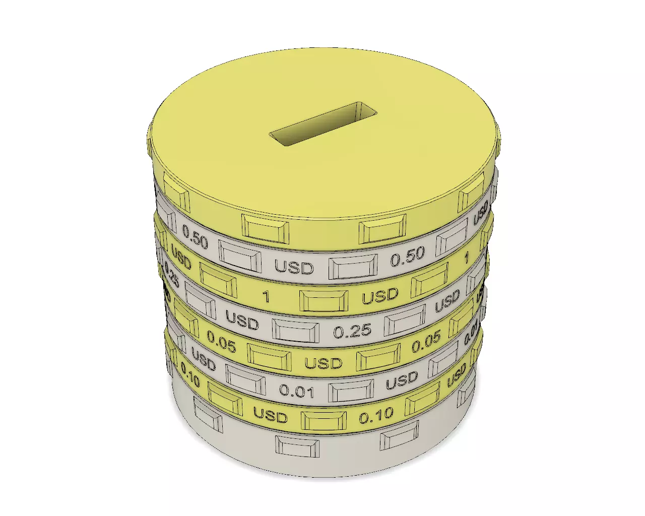 Coins: 0.01, 0.05, 0.10, 0.25, 0.50, 1 (Cent, Nickel, Dime, Quarter Dollar, Half Dollar, Dollar)