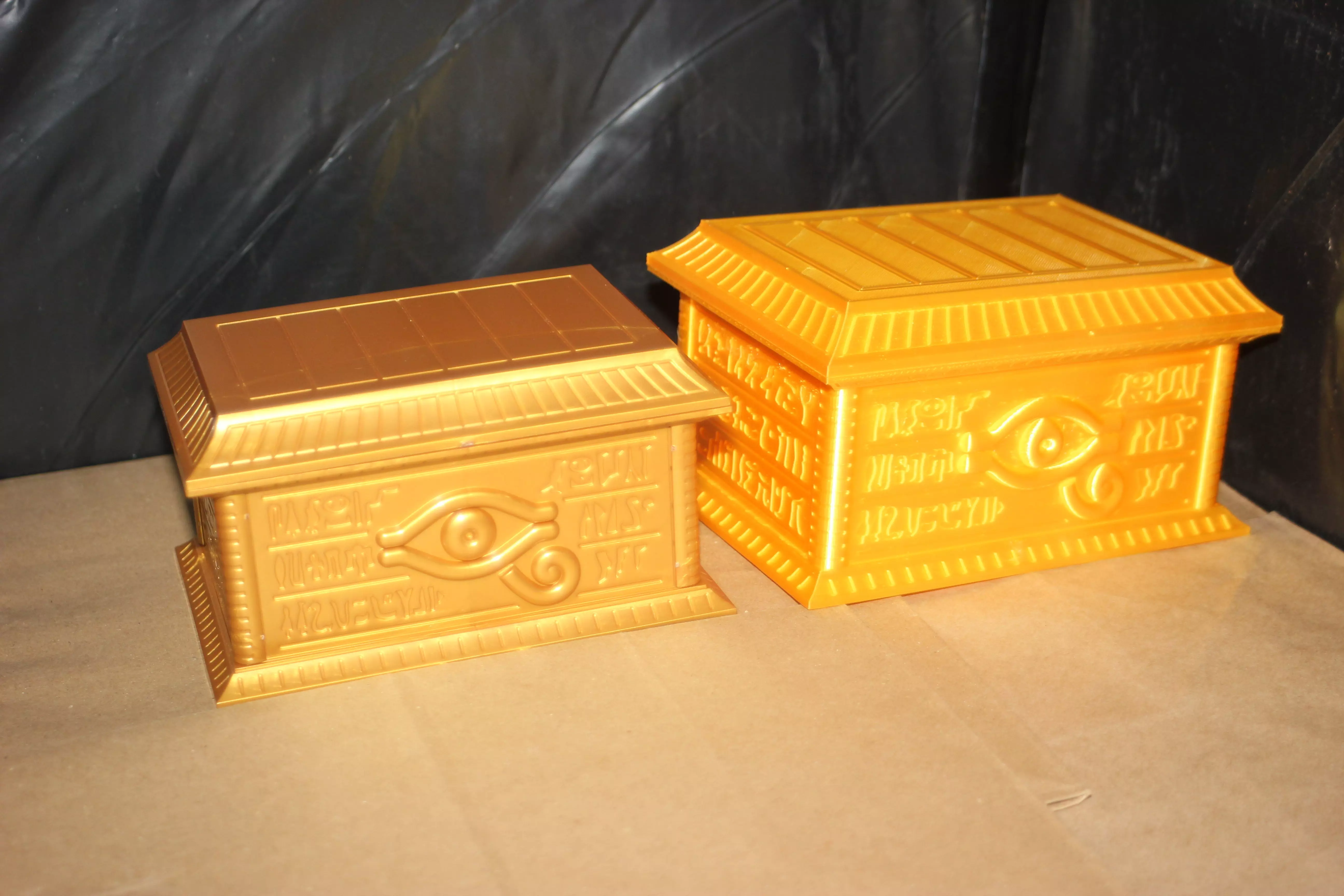 I was extremely irritated to have gotten the new Yu-Gi-Oh Gold Sarcophagus only to find out that it wasn't wide enough to hold two decks side by side. So I made a replica to Print it large enough to fit two decks with additional card sorting dividers that can alsodouble to conceal the cards as well.