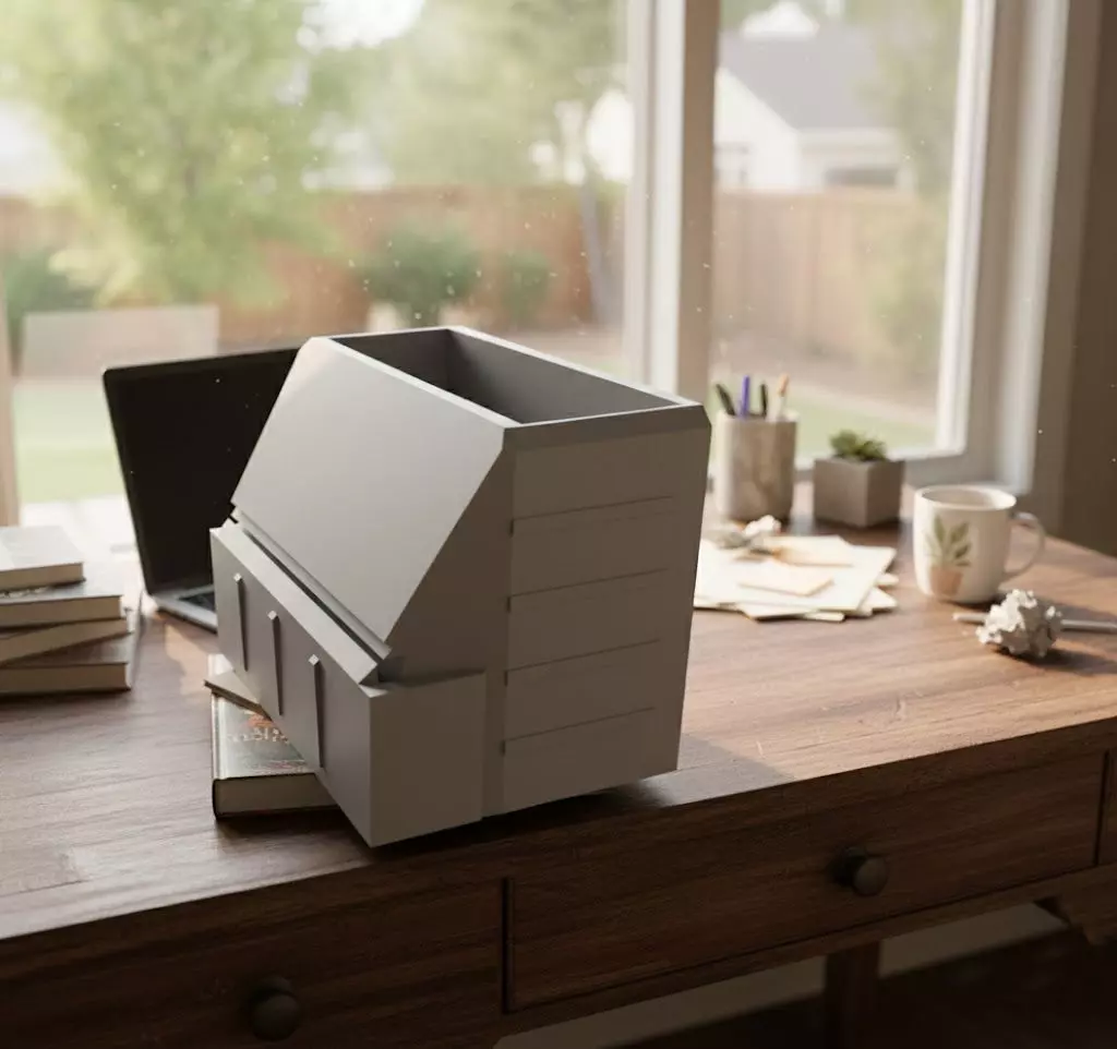 This isn't just a pen holder; it's a structural logistics unit for your desktop operations. Designed with a distinct industrial sci-fi aesthetic, the Cyber-Crate features reinforced angular bumpers, passive cooling-style ribbing, and armor plating details that turn mundane office storage into a display piece. The geometry is optimized for FDM printing with a massive flat base for bed adhesion and self-supporting chamfers (45°) throughout, ensuring a clean print without the need for support material. It offers two distinct zones: a deep rear silo (85mm internal height) for pens, markers, and tools, and a shallow front bay (35mm height) for USB drives, SD cards, or fasteners.