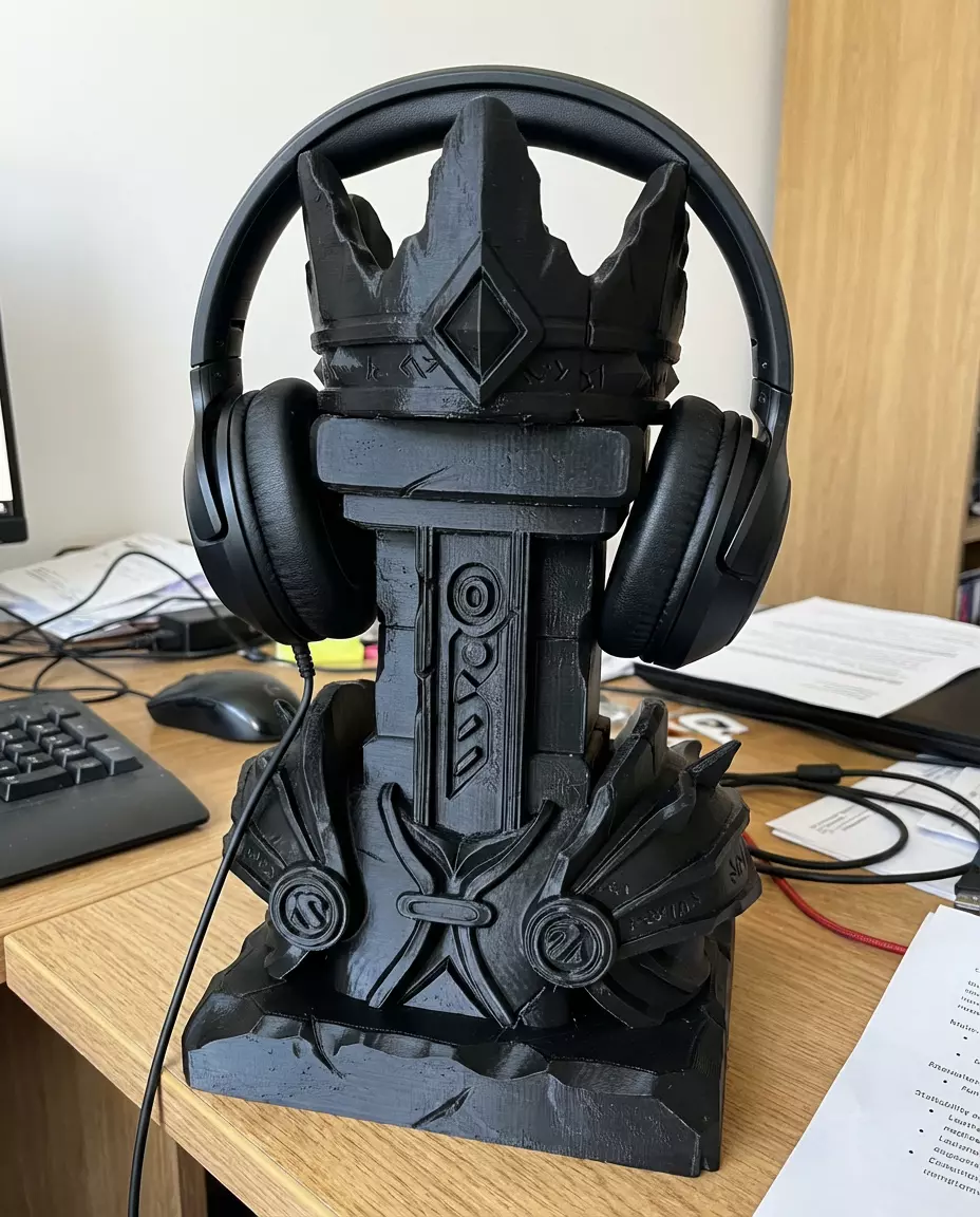 Rule your gaming setup. This heavy-metal inspired stand features a sword embedded in a stone column, topped with a king's crown. The rugged stone texture contrasts beautifully with the sharp geometric crown.