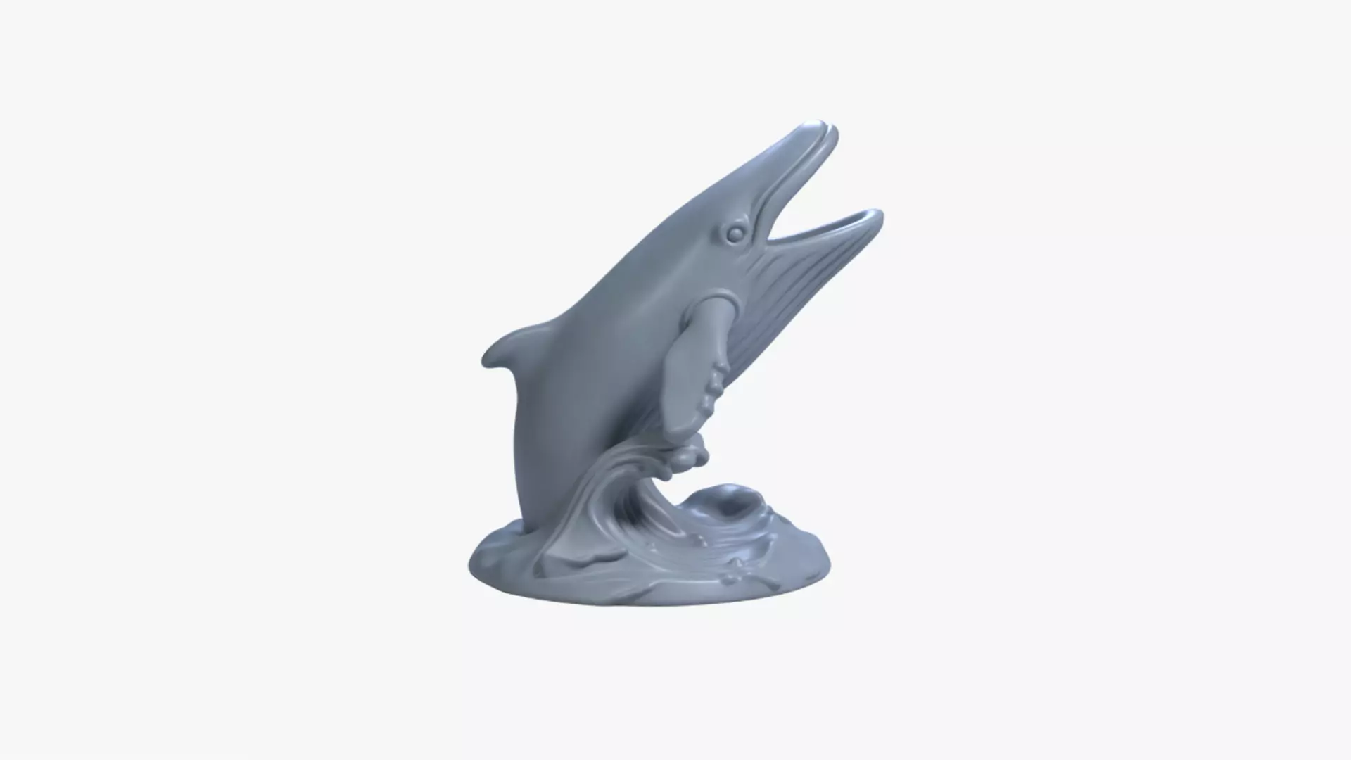 A dynamic desk/shelf sculpture of a humpback whale bursting from a stylized wave. The piece is decorative (not a pen holder): the mouth is open as a pose only, with clean, closed geometry. Flowing baleen grooves, tubercles, and a rocky wave plinth create a natural, collectible look. Designed for stability with a broad base; light supports may be needed under the pectoral fins and roof of the mouth.