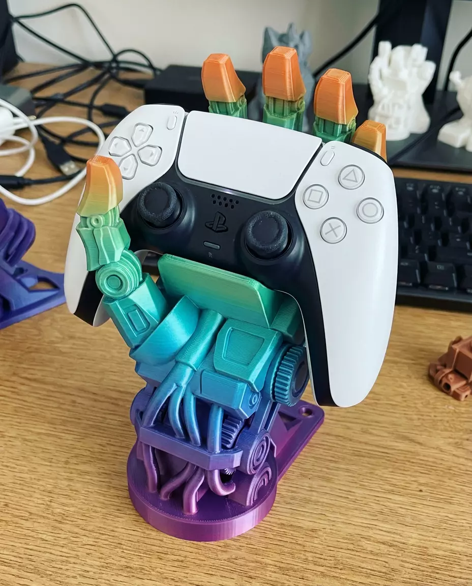 A helping hand for your gaming gear. This detailed mechanical robot hand is sculpted to securely hold PS5, Xbox, or Switch Pro controllers. The futuristic design fits perfectly into any sci-fi or tech-themed setup.