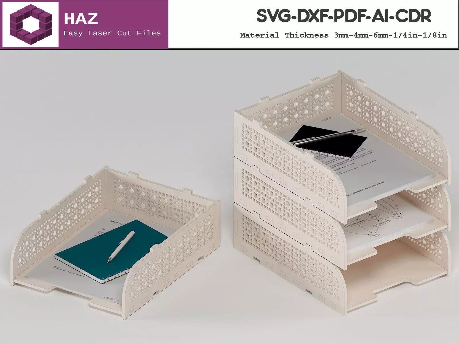 Declutter your workspace and add a touch of modern elegance with this Stackable Wooden Paper Tray Laser Cut File! This digital design enables you to create a practical and stylish organizer that combines functionality with a sleek aesthetic. Ideal for home offices, studios, and any workspace needing a tidy solution.