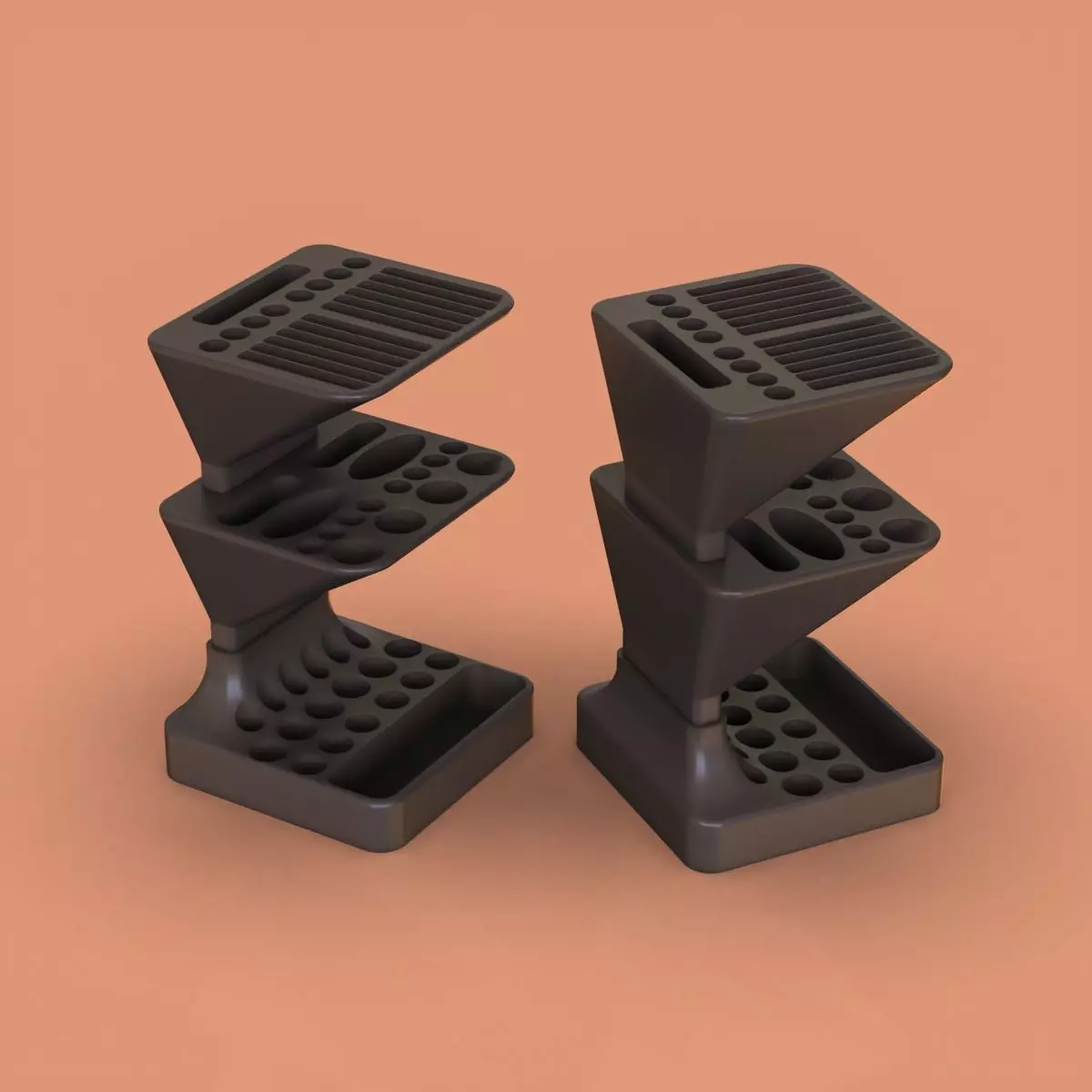 This tool organizer features a sleek, multi-tiered design with varied hole sizes and slots to accommodate different tools, ensuring a clean and organized workspace.