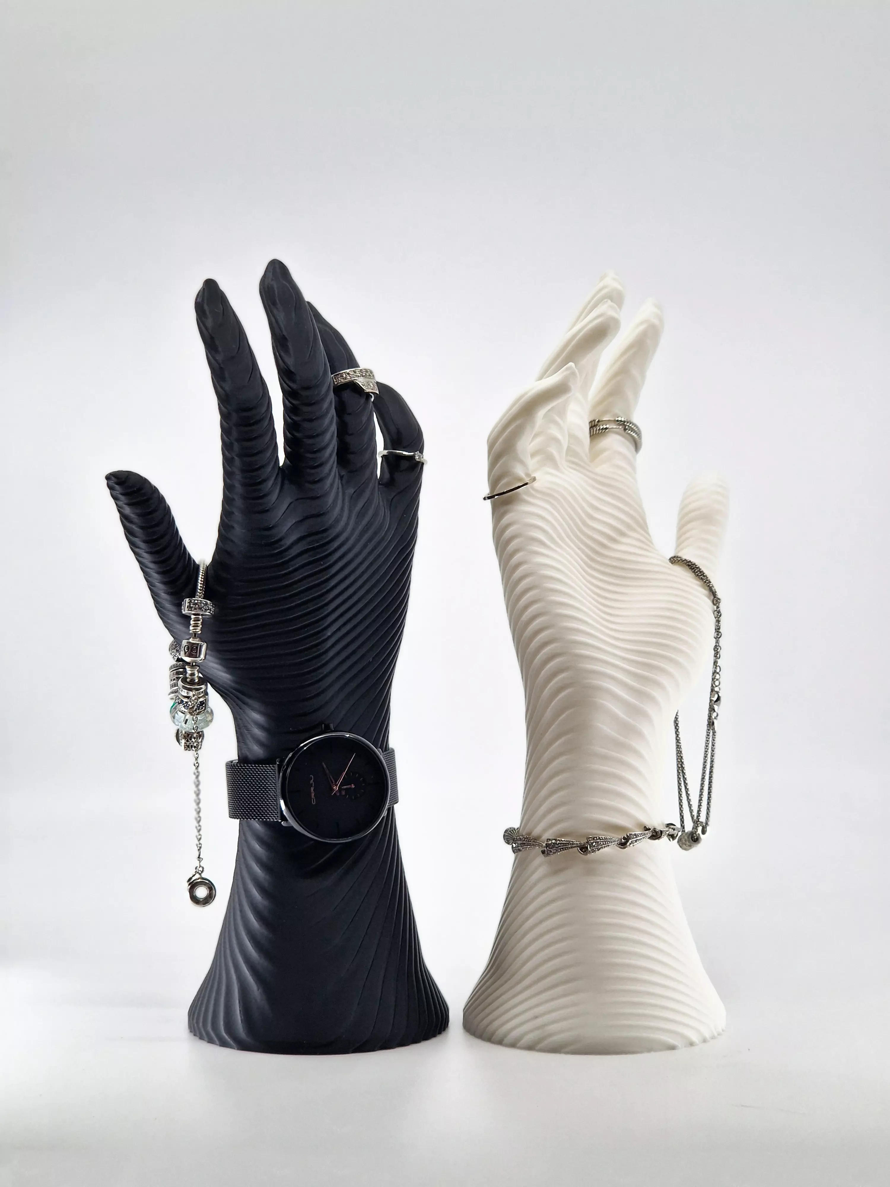 Display your jewelry in style with this elegant, modern Hand Jewelry Stand. Perfect for showcasing rings, bracelets, necklaces, and even watches, this stand is designed to mimic the graceful curves of a hand, providing a striking and functional decor piece.