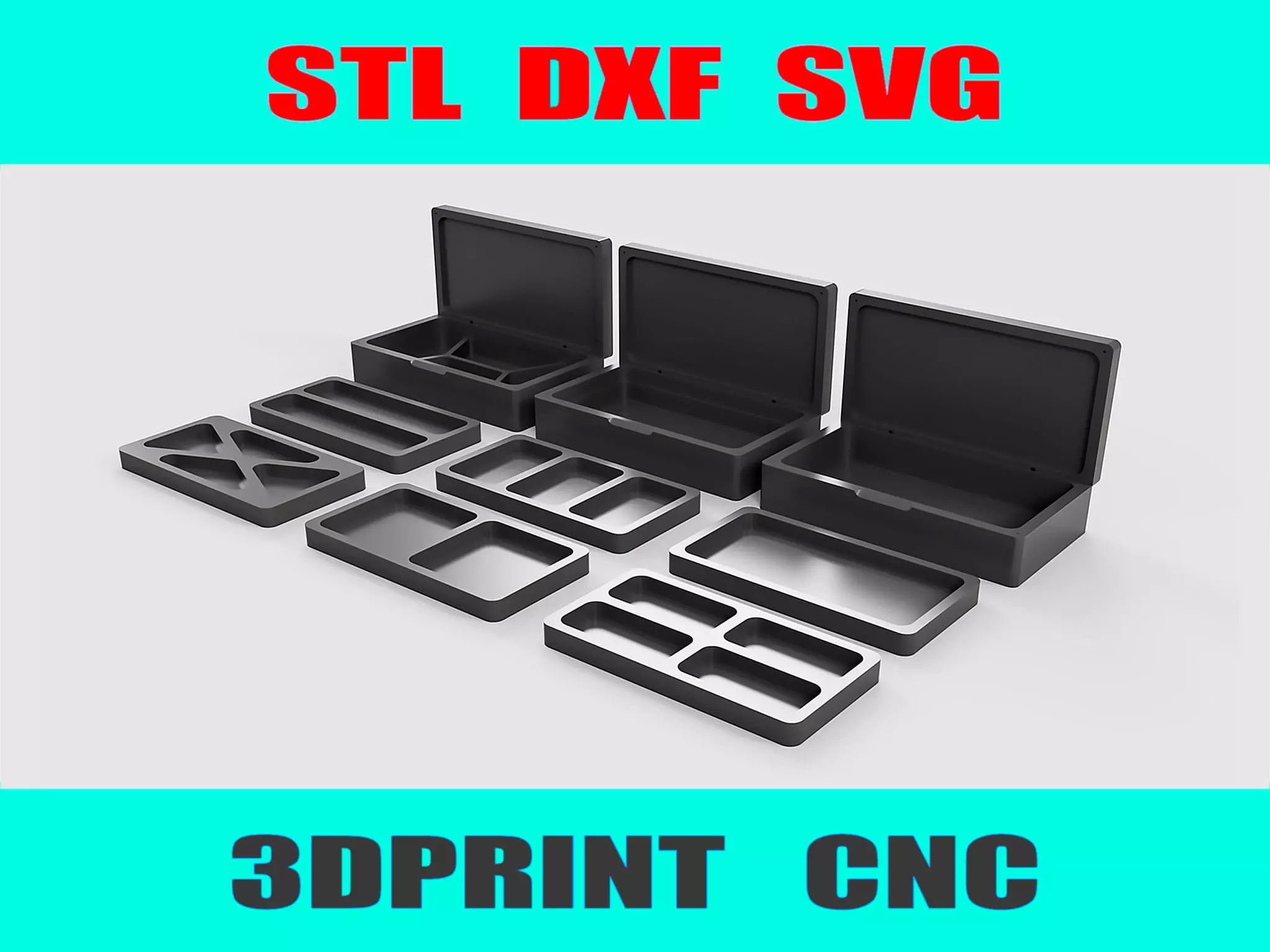 This Modular Jewelry Boxes Set is perfect for DIY enthusiasts, CNC milling, or 3D printing. The set includes three main boxes and six interchangeable trays, allowing you to customize the internal layout to suit your needs. Ideal for organizing jewelry, small accessories, or personal belongings.File format: STL.Dimensions: Each box measures 230mm x 130mm x 60mm.Compatible with PLA, ABS, PETG, or wood for CNC machining.