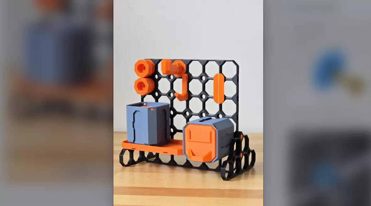 This system features a hex-grid multiboard panel with interchangeable accessories, allowing you to organize tools, parts, and everyday items efficiently. The modern geometric design combined with a bold dual-color aesthetic makes it perfect for both practical use and stylish setups.