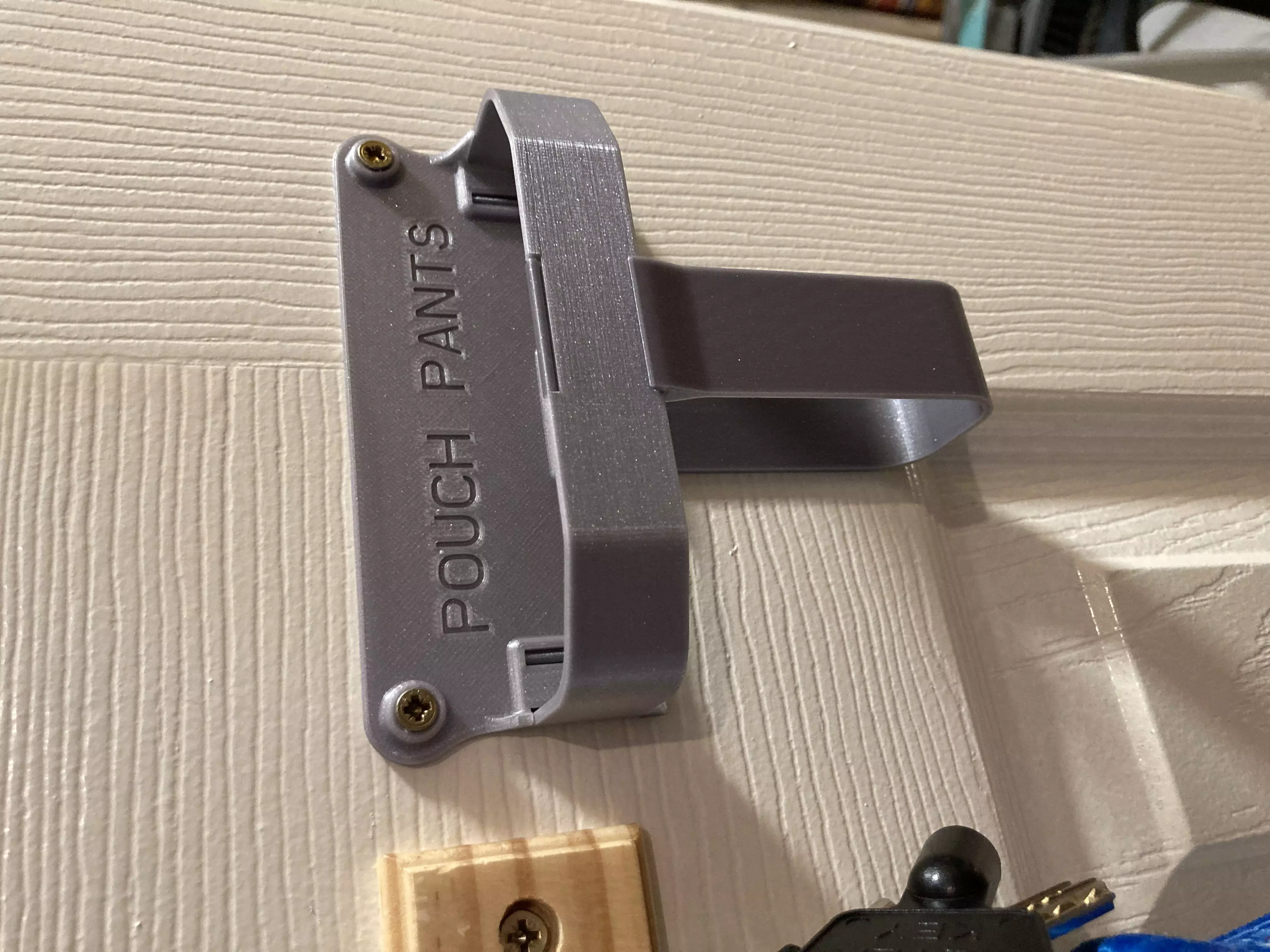 I have designed a wall mount holder that comprises of 3 clip together 3D printed pieces. The Pouch Pants are designed to hold the Solon Security Defender Mobile Phone and Key Signal Blocking Case Pouch.I used to try and hang the pouches on the hooks seen in the images but they keep falling off so I came up with this design. The first incarnation was a one piece design but after re-developing it and 3-piece design seemed more suitable, if parts break I can print a small section, the printing time was reduced by circa 30% and it also gave higher quality finished parts due to being able to orient the parts to suit printing direction better with far less supports.