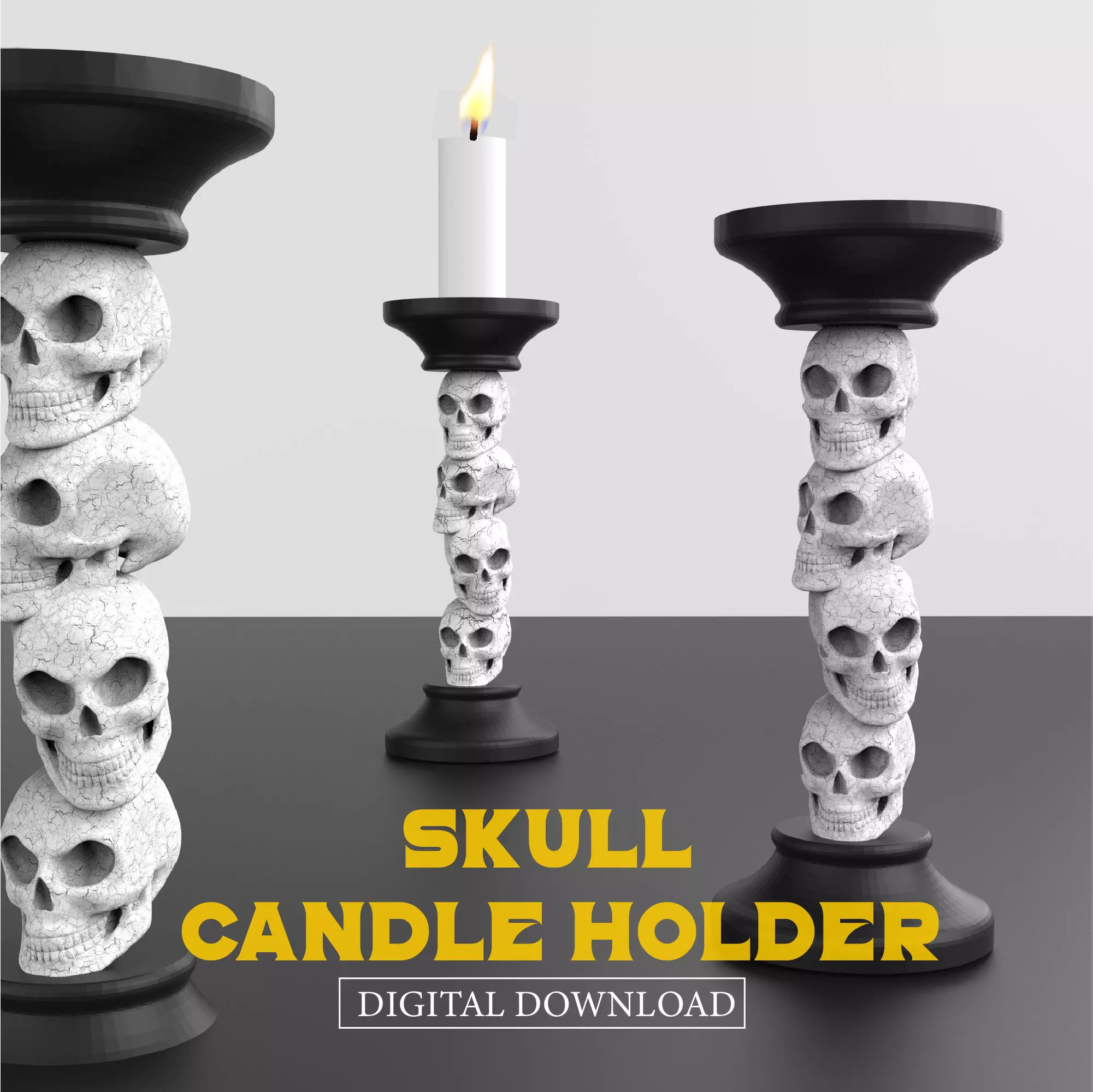This 3D STL file download features an intricately designed human skull that serves as a hauntingly beautiful candlestick holder. Whether you're decorating for Halloween or adding a dark, mysterious vibe to your home, this skull holder is a striking addition to any gothic setup. It’s the perfect piece for creating a spooky atmosphere, making it ideal for both Halloween parties and year-round gothic decor.