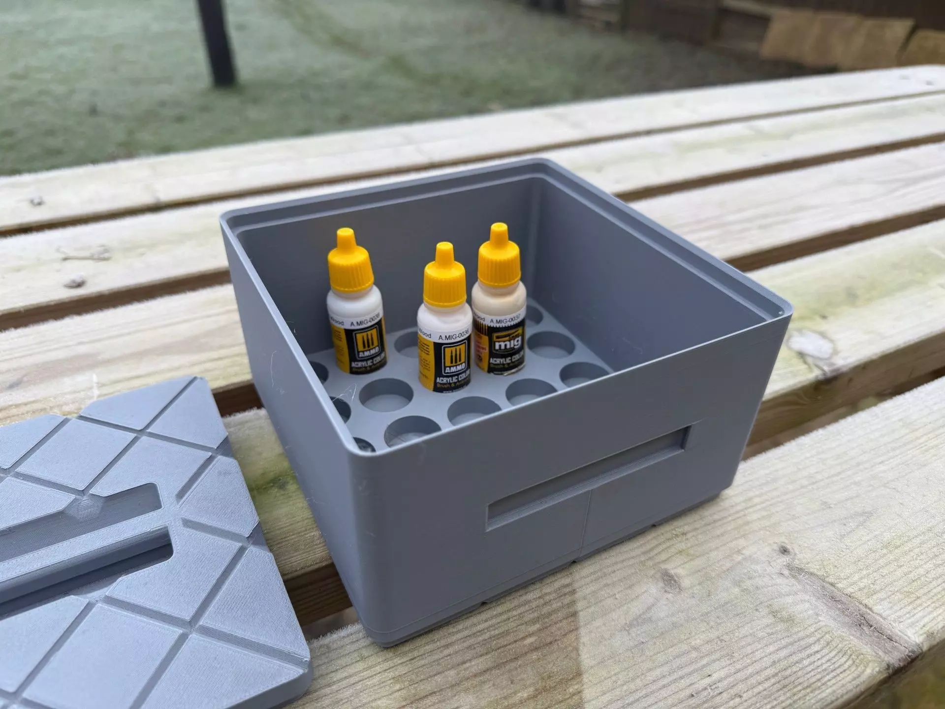 The idea was to create a universal tray for each type of paint that can be stored on top of each other. The size of the tray has been designed to be 160mm x 160mm and will therefore fit on most FDM printers. The lid has also been designed to be printed inverted so the build plate pattern will be on top of the lid enhancing to look.The chequered effect on the base and the top of the lid is to also helps with reducing the chance of warping when printing.