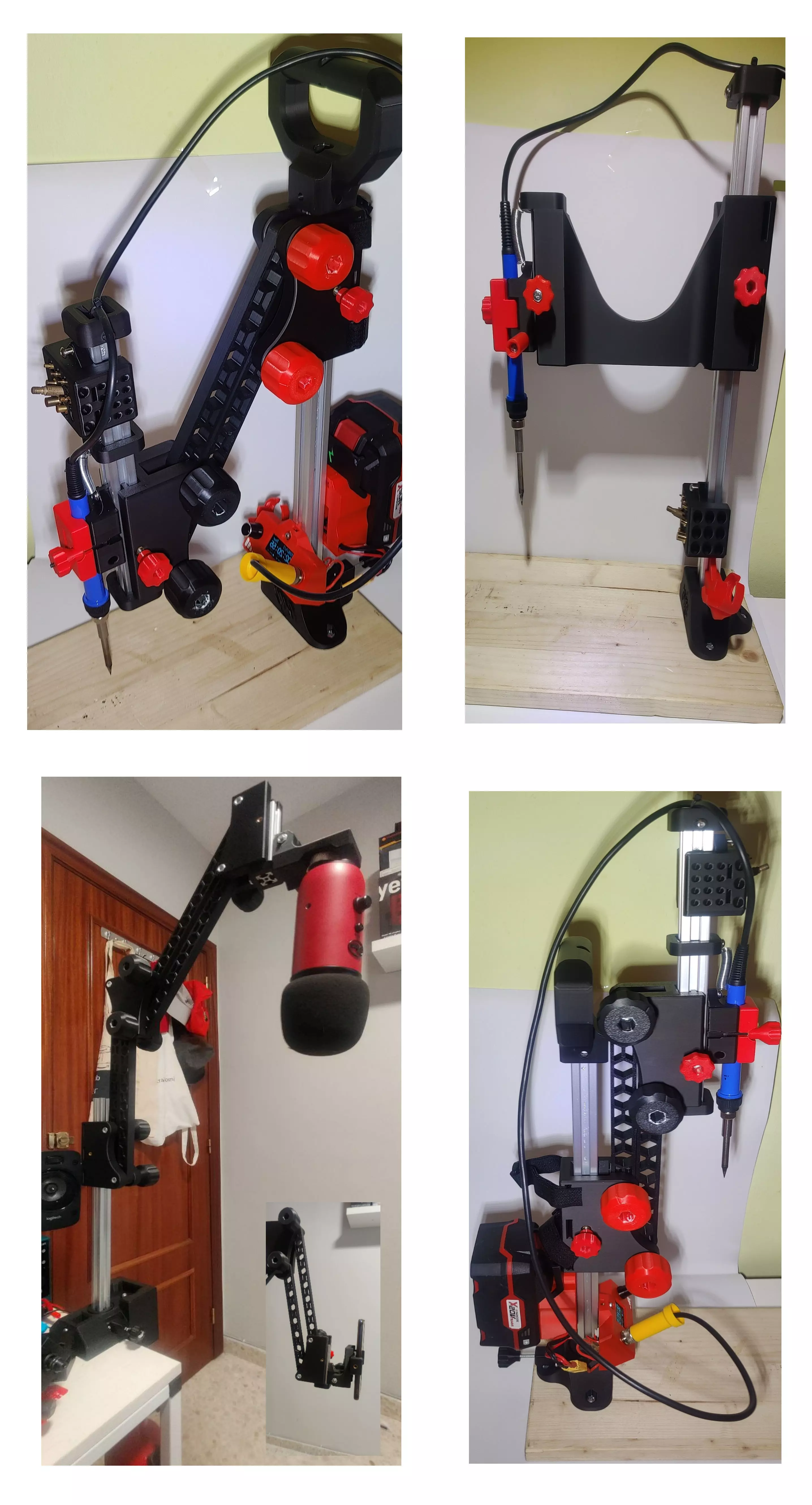 Puedes usarlo como prensa de insertos de latón, como soporte de multiherramienta ( Dremel o similar ), como soporte de micrófonos y teléfonos inteligentes, soporte de escaner 3D, etc.