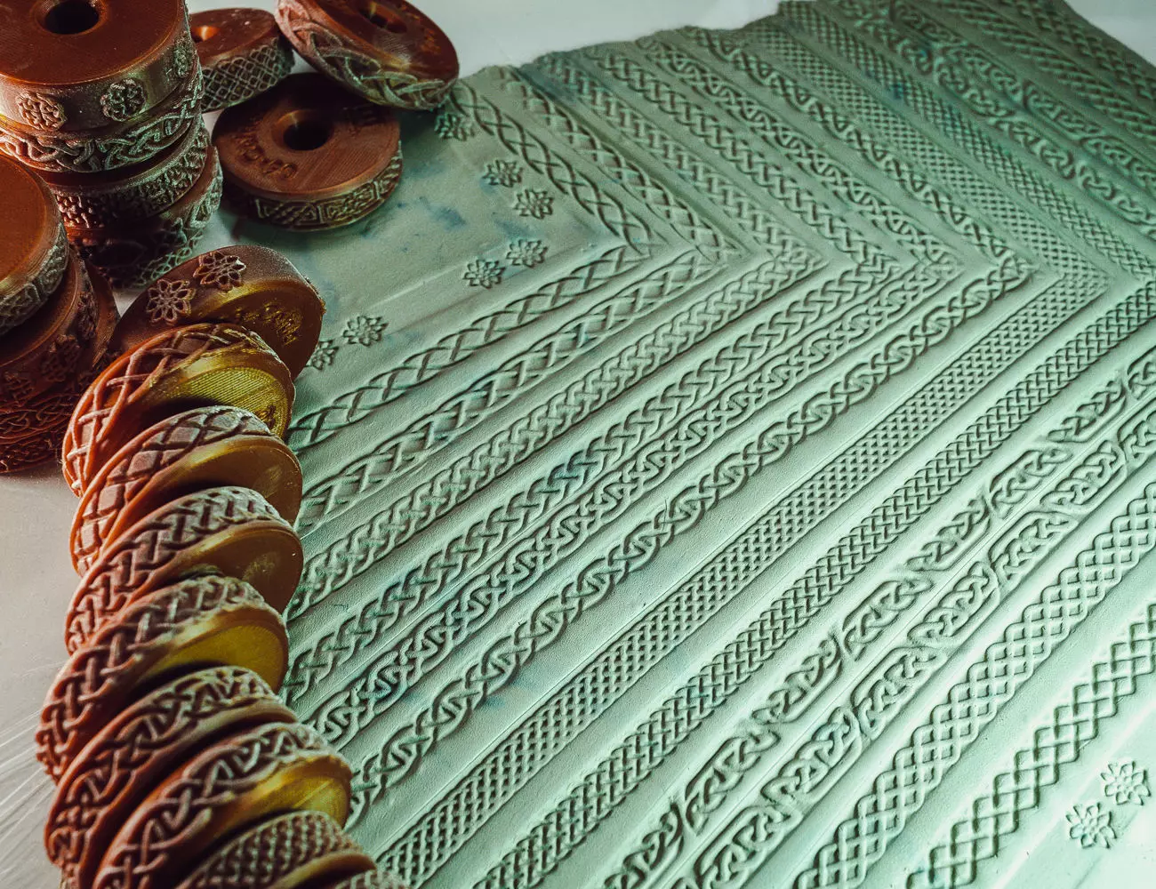 The download contains 26 OBJ files (reversed patterns included) of wheels and a handle ready to be 3D printed. The wheels create various Celtic patterns inspired by the Celtic knot designs.
