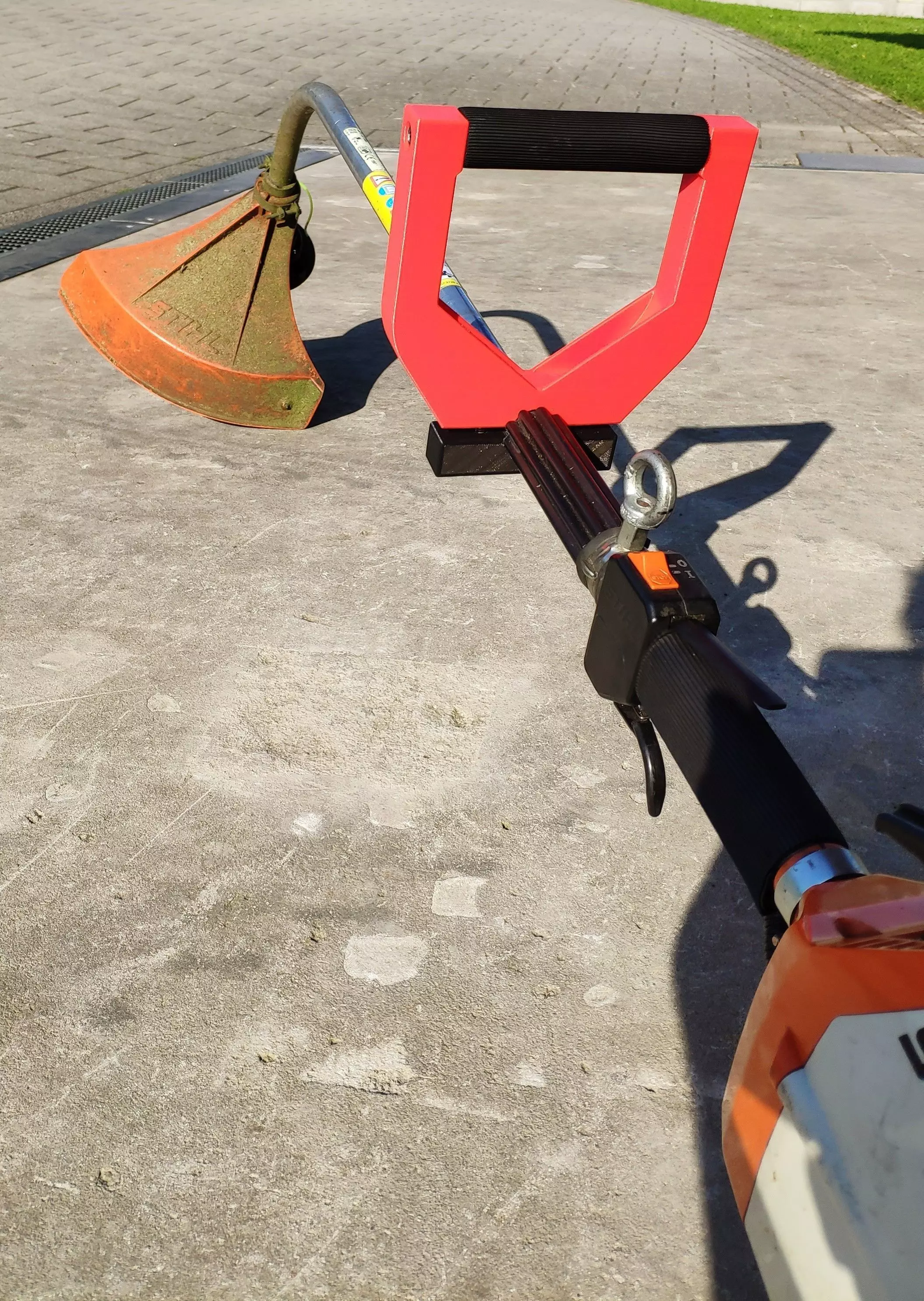 I created a new handle for STIHL devices. I tested it at the STIHL FS36 (=brush cutter), but it also fits on other devices (e.g. STIHL KM131R), if the diameter of the pipe is 25,4mm = 1 inch.