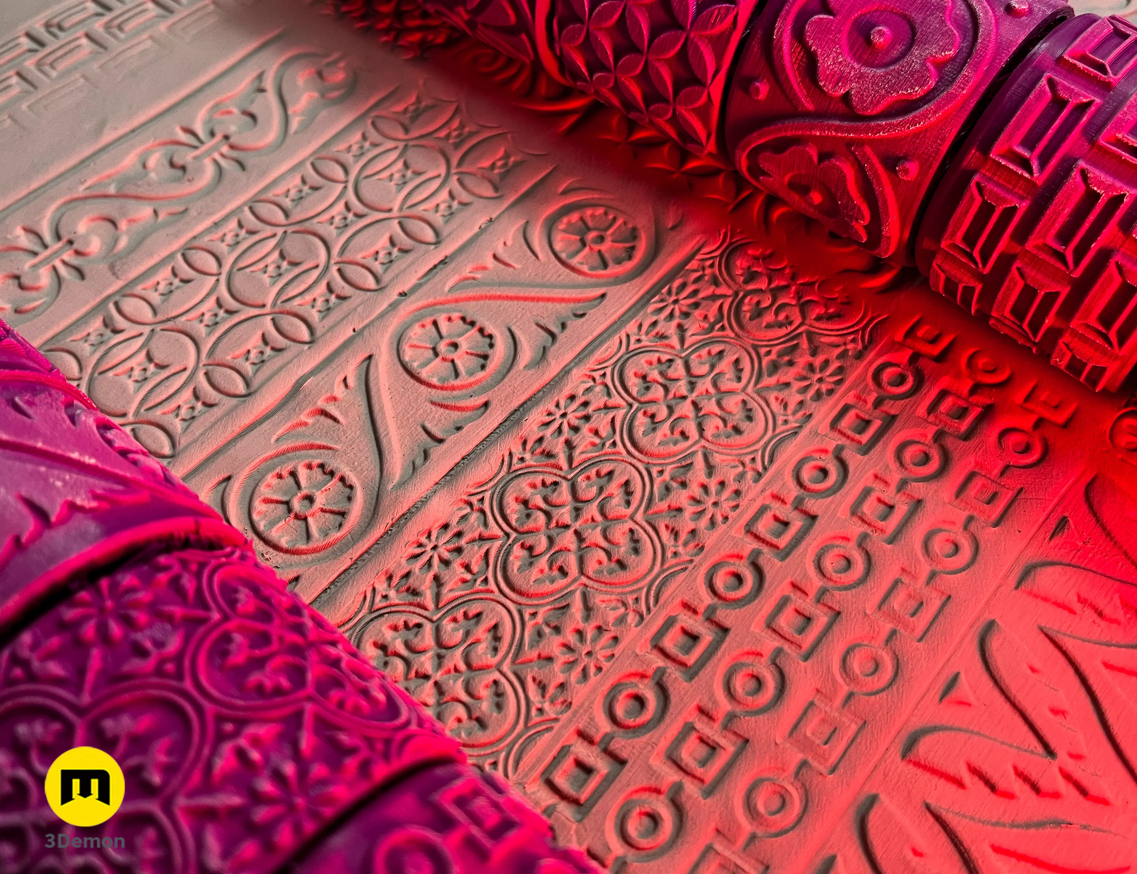 These digital 3D printable models of Stamp Wheels are meant to be used to create textures in clay and polymer clay, pottery clay, cake dough, fondant, fabric, and other materials. This wider Renaissance pattern set is great for creating patterns on clay or fondant!The download contains 18 OBJ files of wheels and a handle ready to be 3D printed. The wheels create various Renaissance patterns.