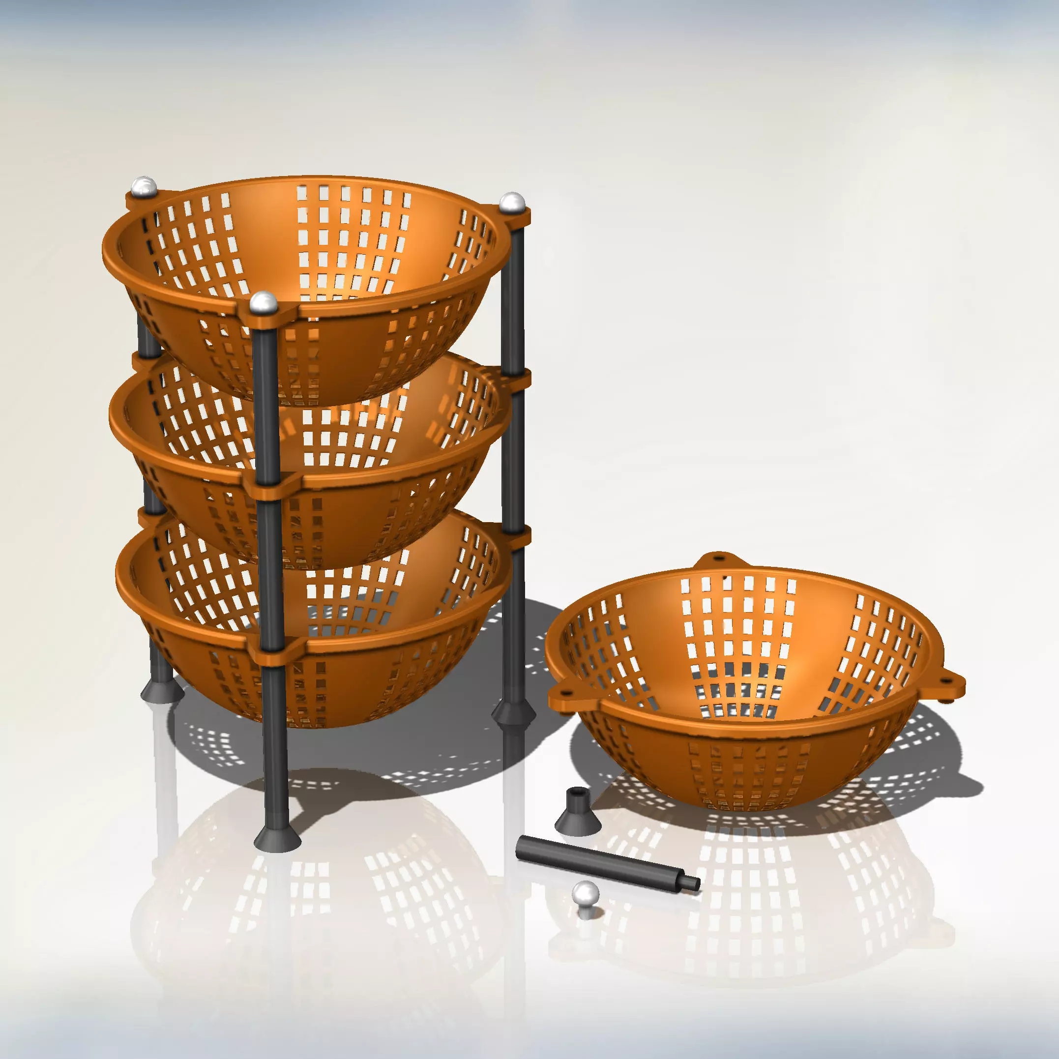 Assembly Instructions: Print the parts: basket, support pipe, cap, foot pad. Interlock 3 support rods with the base of each basket layer, ensuring a snug fit. The rods are designed to offer simple and secure assembly. Finally, interlock 3 caps and 3 foot pads with the support rods to complete the assembly. More baskets can be added as well. You might need to refer to the images above.