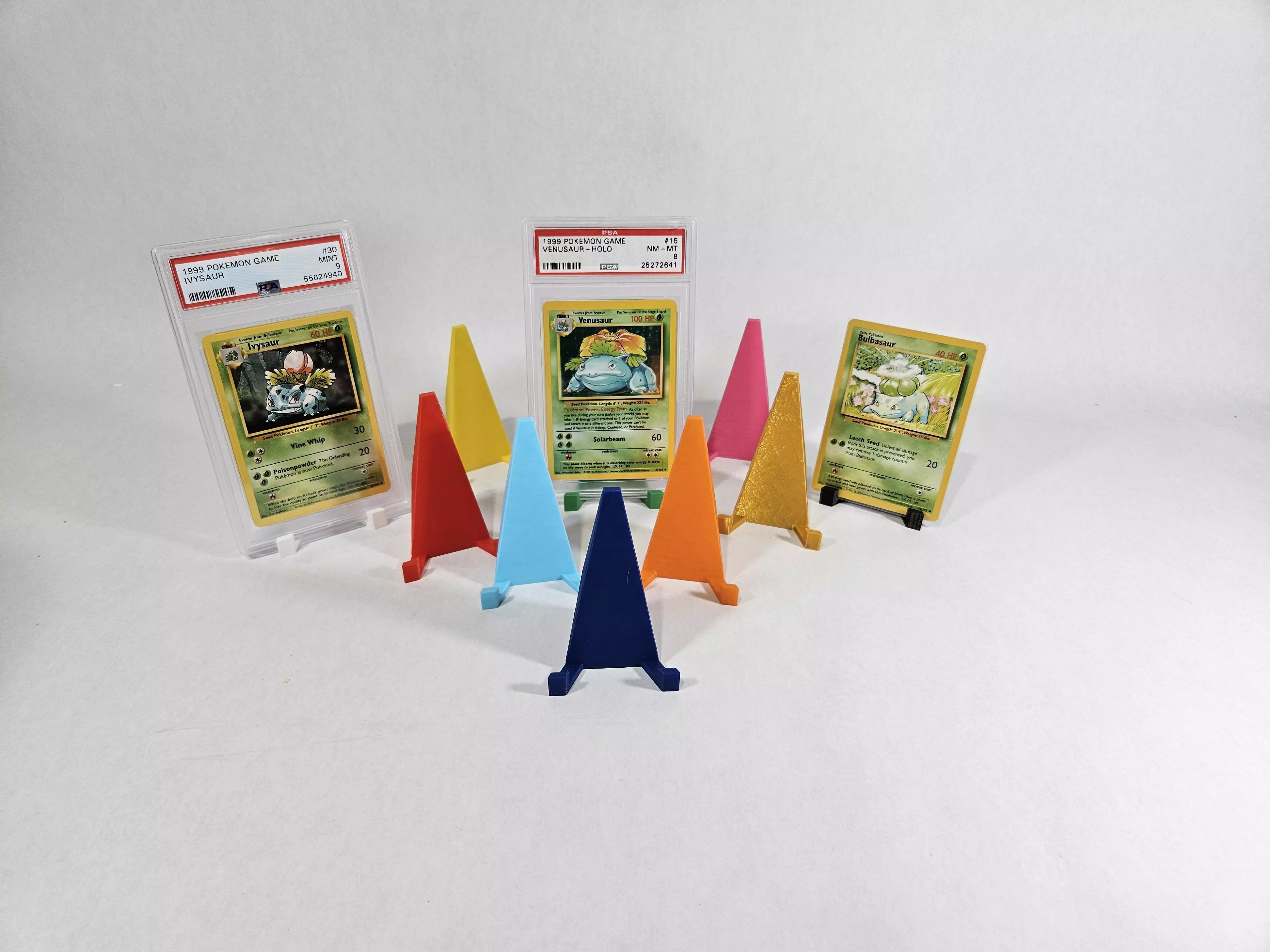 These basic stands are designs to hold all types of raw cards, sleeves and slabs. Each stand is 3D printed out of a light weight plastic. Feel free to mix and match colors with your orders.