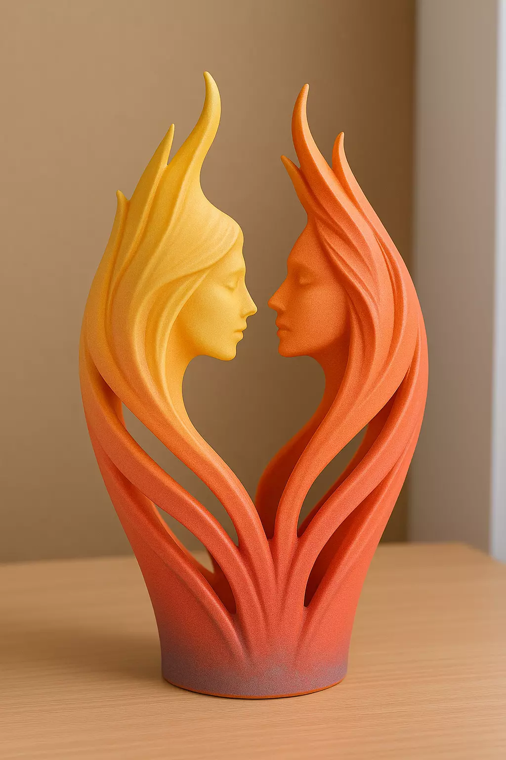 This stunning “Flame Lovers Vase” features two elegant faces emerging from flowing, flame-like curves that blend warmth, motion, and emotion into one sculptural form. The vibrant gradient—from golden yellow to fiery orange—adds a modern artistic touch, making the piece perfect as a decorative centerpiece, romantic gift, or premium 3D-printed artwork.