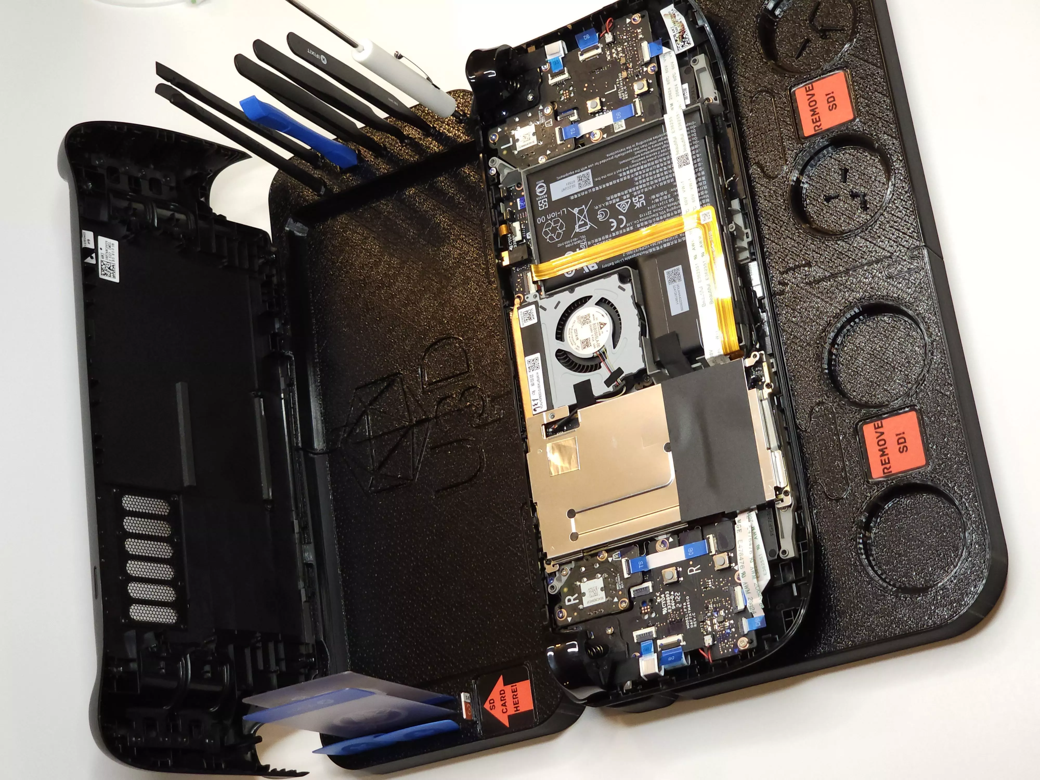I was going for premium feel on this design, the perfectionist in me.... It includes a spot to rest the steam deck face down without messing with any controls or the screen, it fits like a glove.Above that you have the component pad, to organize components as you remove them, where they will be safe from accidentally getting knocked off the table or lost. Above that is a kickstand feature for the steam deck back plate. To the left and right are docking stations for all your standard iFixit tools (the ones I modeled it for are in the photos), also including a slot to store your SD card while you are working on your steam deck.