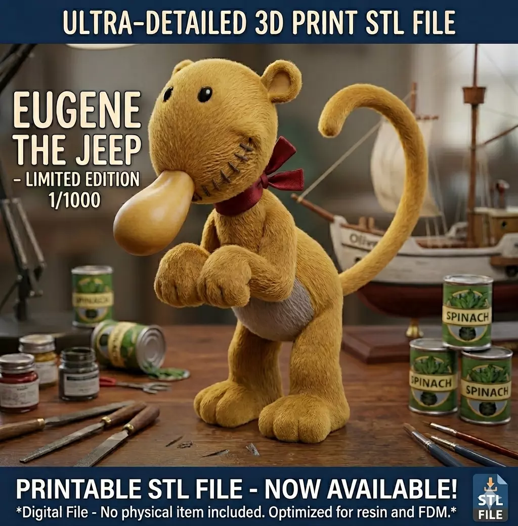 This high-quality STL file is meticulously designed for fans of classic animation. Eugene the Jeep, the mysterious and lovable character from the Popeye universe, is now ready to be 3D printed. This model captures his unique charm, from his iconic tail to his friendly expression.