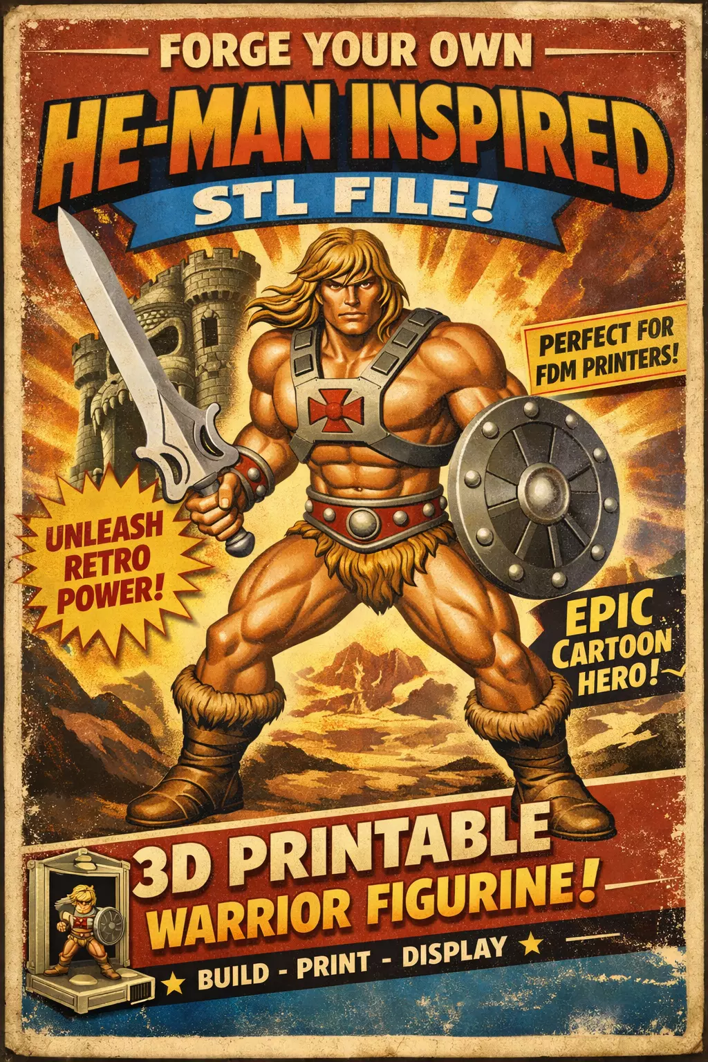Channel the power of Eternia with this He-Man inspired STL file, designed for FDM 3D printing (not resin). This digital sculpt features a muscular cartoon-style warrior wielding a sword and shield, perfect for collectors, fantasy fans, and tabletop enthusiasts.