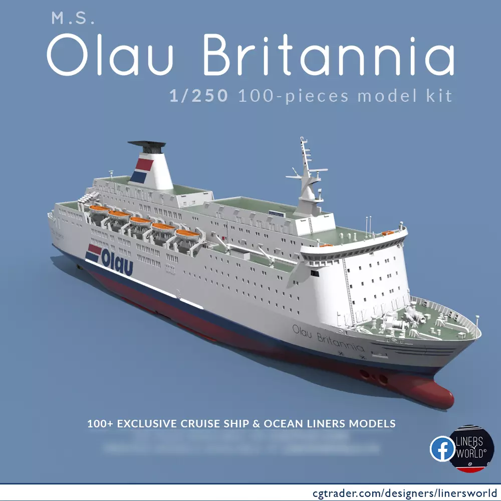 A highly detailed and accurate 1/250 scale model of the Olau Britannia ferry, consisting of over 100 parts (see pictures for details). A PDF for decals is included. The model can be easily printed at both smaller and larger scales.