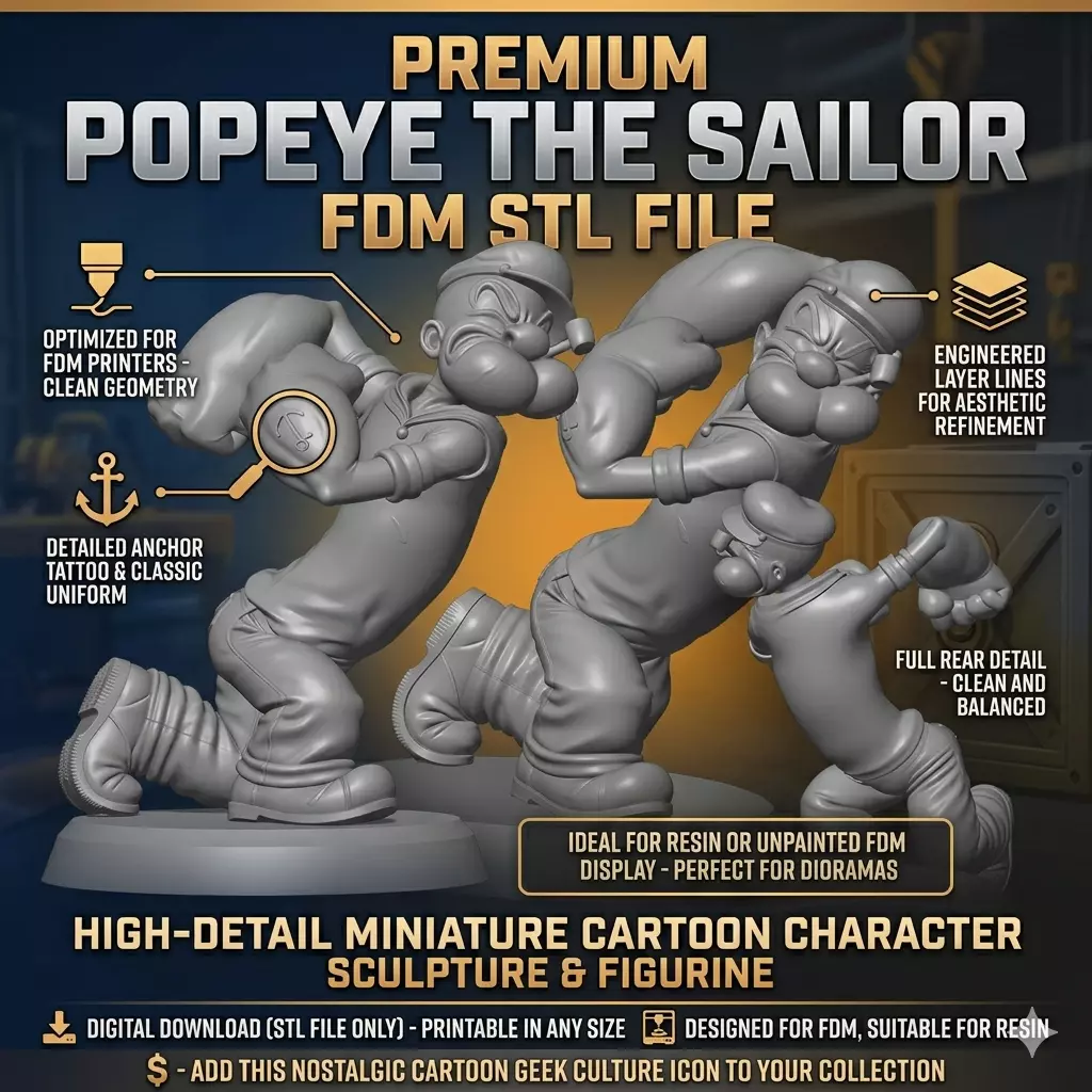 Get ready to print your own iconic cartoon hero with this detailed STL file of Popeye the Sailor Man! Perfect for FDM 3D printers, this model is designed to be easily printed and assembled.