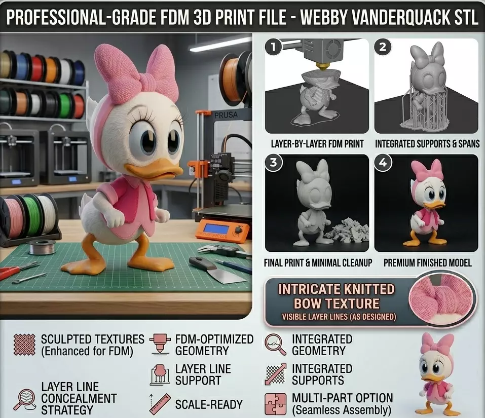 Bring the adventurous spirit of Duckburg to your collection with this premium Webby Vanderquack 3D print file! This model has been specifically sculpted and tested for FDM (Filament) printers, ensuring that the intricate knitted texture of her bow and the delicate feather details come out perfectly even without a resin printer.