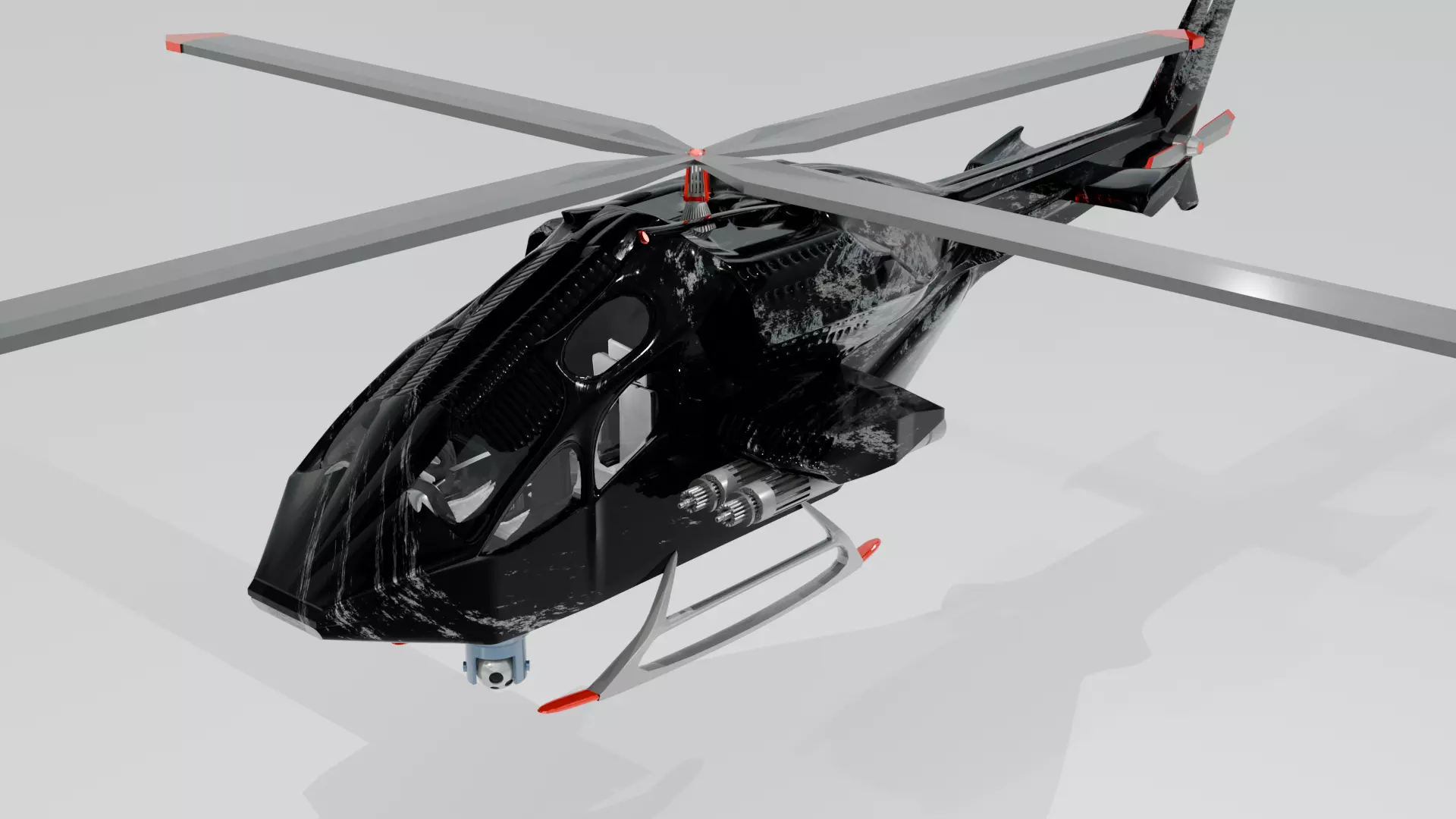 The helicopter has a shiny black color, with reflections that indicate a smooth, polished surface.The rotor blades are long and thin, with tips painted red for visibility.The president's body is compact and aerodynamic, with transparent windows that allow you to see the interior.Mechanical details are visible on the bottom and side of the helicopter, pointing out mounting points and possible weapons or sensor systems.The model is positioned against a solid white background that contrasts sharply with the dark color of the helicopter.Additionally, this model can be animated in Blender, allowing for realistic rotor blade movements, body rotations and other actions. Animation would add life and dynamism to the project