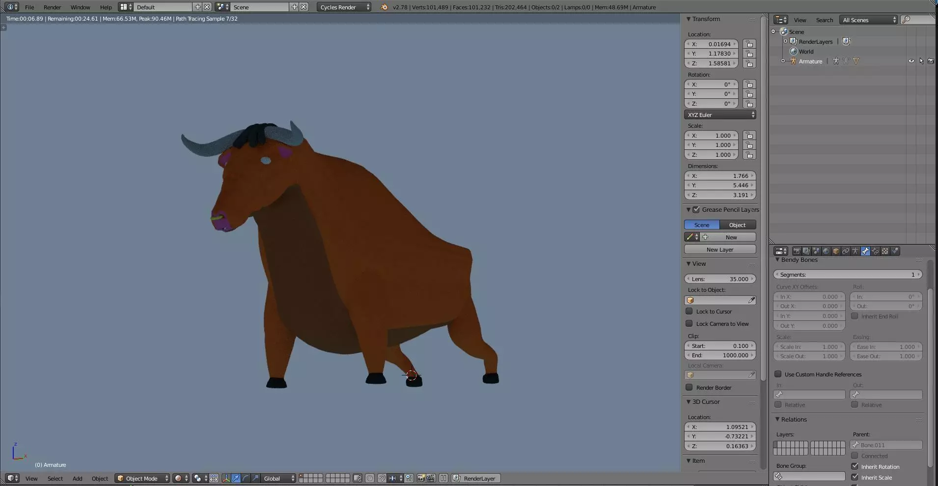 The model has material settings that define how surfaces look (color, shine, transparency, etc.).