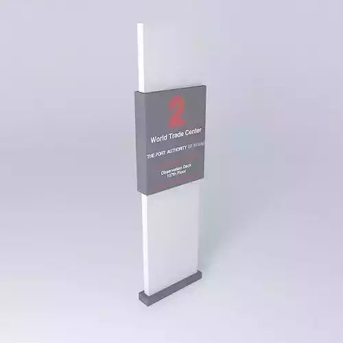 This 3D model was originally created with Sketchup 8 and then converted to all other 3D formats. Native format is .skp 3dsmax scene is 3ds Max 2016 version, rendered with Vray 3.00 This was the original design of the Austin Tobin Plaza lobby signs that stood at various points around 2 World Trade Center. The model is NOT photo-textured. Many thanks to WTComplete for both the original sign, and all of the great models under the WTComplete name.