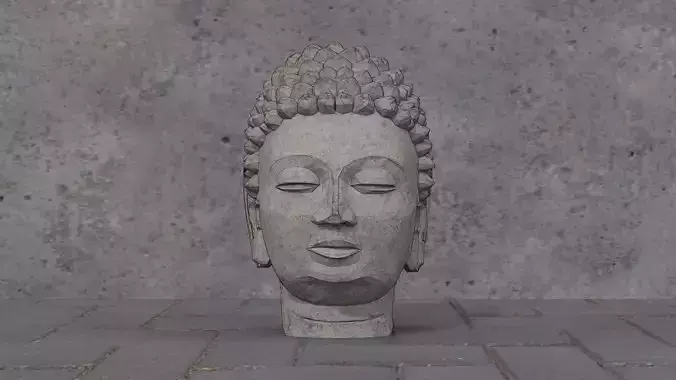 This 3D model depicts a Buddha head sculpture, meticulously crafted from a stone-like material that imparts a weathered, ancient appearance. The sculpture exudes a profound sense of serenity and meditation, with its symmetrical face featuring closed eyes that convey deep tranquility and a subtle, gentle smile that radiates compassion and enlightenment. Atop the head, a prominent ushnisha—symbolizing wisdom—is rendered as a textured cluster of small, rounded curls, while the elongated ears, a hallmark of Buddhist iconography, signify the Buddha's attentiveness to the world's suffering. The sculpture is set against a minimalist background of a paved stone pathway and a plain, textured wall, which subtly enhances its timeless and contemplative aura.
