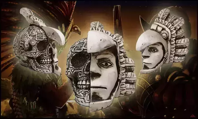 A dual face-skull decoration from Mexico, in left side the skull with a very detailed engravings and the right side Cuauhtémoc a representative character or the period.