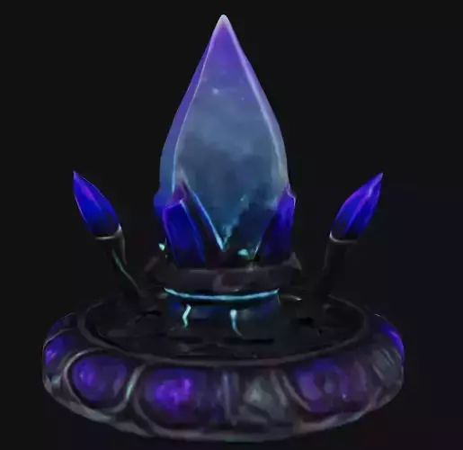This sci-fi shrine pulsates with otherworldly energy, centered around a glowing crystalline core encased in an ornate, metallic base. The translucent crystal emits hues of blue and violet, suggesting it stores vast amounts of alien power. Three pronged emitters surround it, possibly acting as stabilizers or conduits for energy flow. The intricate engravings on the base hint at an advanced or ancient civilization, blending mysticism with futuristic technology. The shrine could serve as a power source, relic, or teleportation beacon. Ideal for sci-fi environments, alien worlds, or arcane-tech hybrid settings in games or animations.