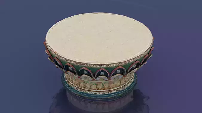 This 3D model represents a traditional lotus pedestal, or liánzuò, a significant element in East Asian Buddhist art and architecture. Crafted with meticulous attention to detail, the pedestal features a wide, circular top adorned with delicate, swirling patterns in a light beige tone, evoking the elegance of lotus petals or cloud motifs. The sides are intricately decorated with vibrant bands of geometric and floral designs, incorporating rich colors such as red, blue, green, and gold. Small semi-circular protrusions and medallions along the edges add a touch of refinement, while the lower section showcases detailed paintings of traditional Buddhist symbols, possibly including lotus flowers and mythical creatures. Elevated on a reflective surface, this lotus pedestal embodies the spiritual and artistic heritage of Buddhist culture, making it a stunning representation of sacred craftsmanship.
