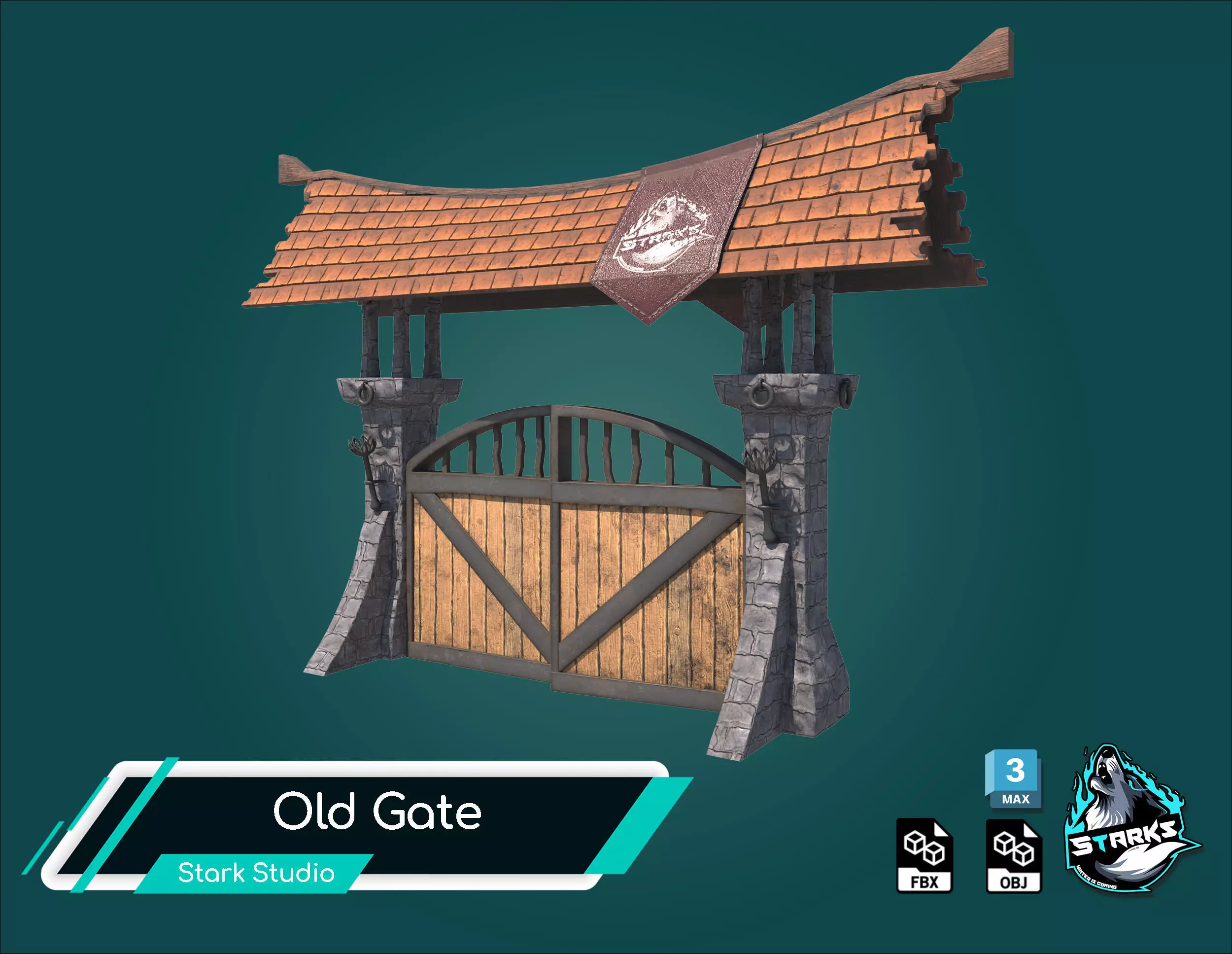 gate 3D model created with 3ds Max and textured with Substance Painter. The textures have a resolution of 4K and are in JPG format. The gate features stone walls and a wooden roof, meticulously detailed to showcase its intricate design.