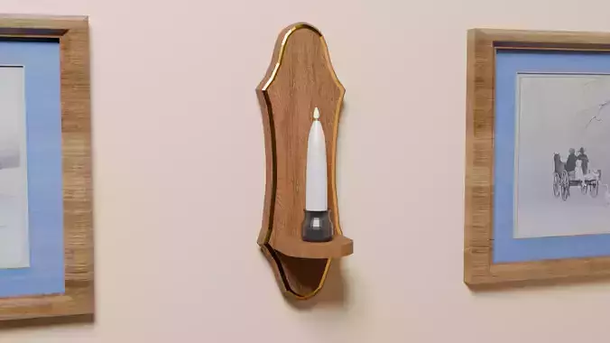 This elegant vintage wall sconce features classic detailing and timeless charm. The design includes a uniquely shaped back plate with softly contoured edges, accented by subtle gold highlights that enhance its antique appearance. A small wooden shelf extends from the base, supporting a simple black candle holder and a matching candle, completing the look. The combination of aged finishes, refined contours, and minimal ornamentation gives this piece a warm, authentic character perfect for traditional, vintage, or rustic interiors. Whether used as a wall accent in a living room, hallway, or bedroom, it adds a touch of nostalgic elegance and handcrafted style. Ideal for historical or period-style renders, this low-poly model balances decorative appeal with simplicity, making it suitable for both realistic and stylized environments.