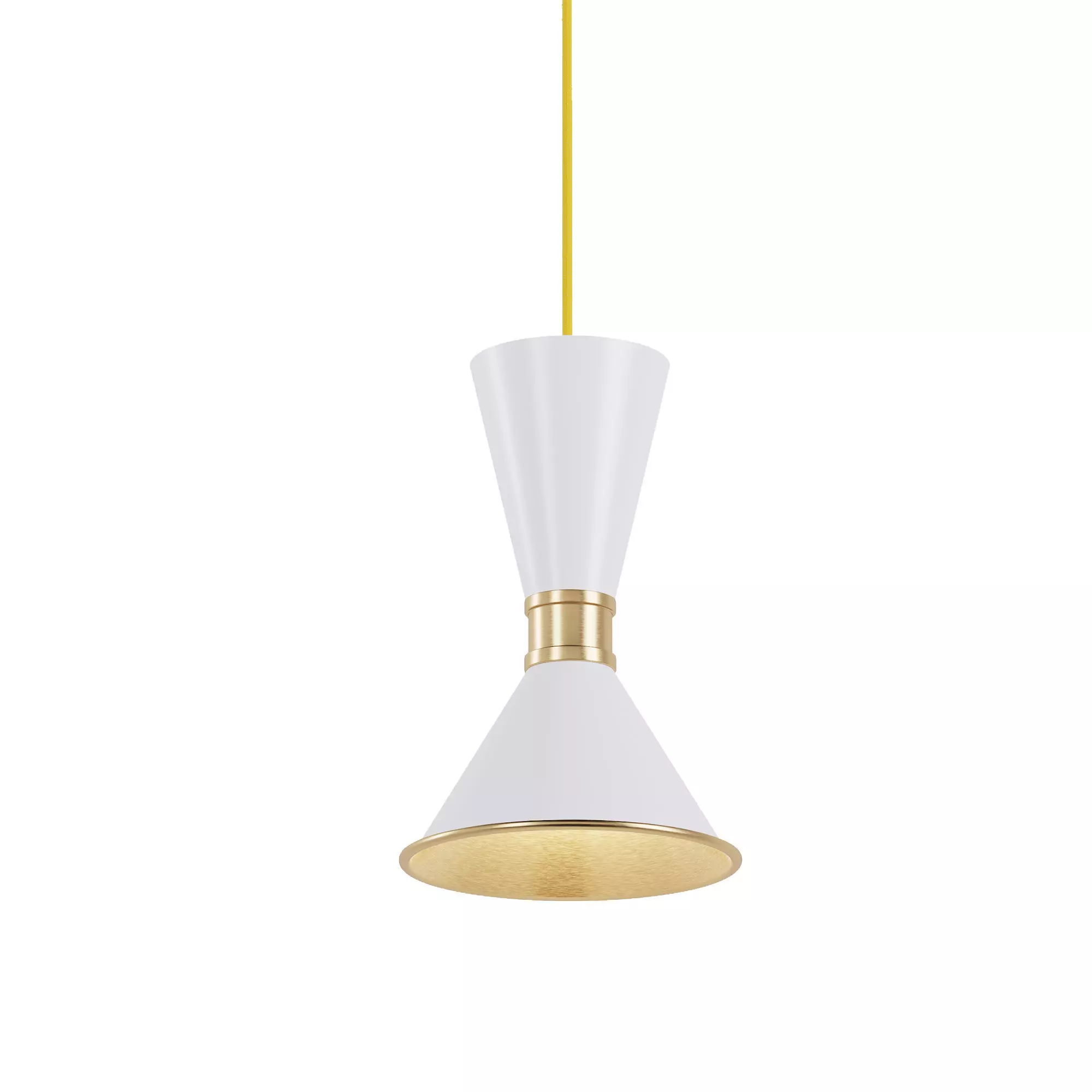 Pendant light Dualight, SKU.12515 by Pikartlights.The Dualights pendant light is another elegant model from the Dualight series. The expressive shade replicates the shape of an hourglass. This unusual geometry will accentuate the forms in any modern interior. Made of high-quality aluminum and brass - the noble shine of which complements the universal style of the matte shades.This is the only product in the Dualight series that contains only 1 light spot. For illuminating a space, you can effectively use several pendants of different lengths or even colors of shades - don't restrain your inner designer on the path to the ideal space.The series palette offers stylish combinations of trendy colors with brass - the pendant is available in white or black finishes, as well as a combination of these colors, and this is with the lower shades completely made of brass.The pendant looks great both as a standalone lamp on either side of the bed in the bedroom, in the kitchen, or, for example, in the bathroom. It will suit both Scandinavian-style lighting and as light in a classic interior. The golden sheen of brass will also complement a minimalist style or loft with this small expressive detail.Look at how three low-mounted pendants fit perfectly over the kitchen island, at the same time adding an interesting accent of forms but also complementing the stylish space. However, the Dualight series lighting is a great option not only for spacious halls or living rooms in your home. It is also stylish and functional lighting for a cool commercial project - for example, lighting for a stylish restaurant or cafe.Made of brass and aluminum, available in 4 colors. For more information please check the product page: