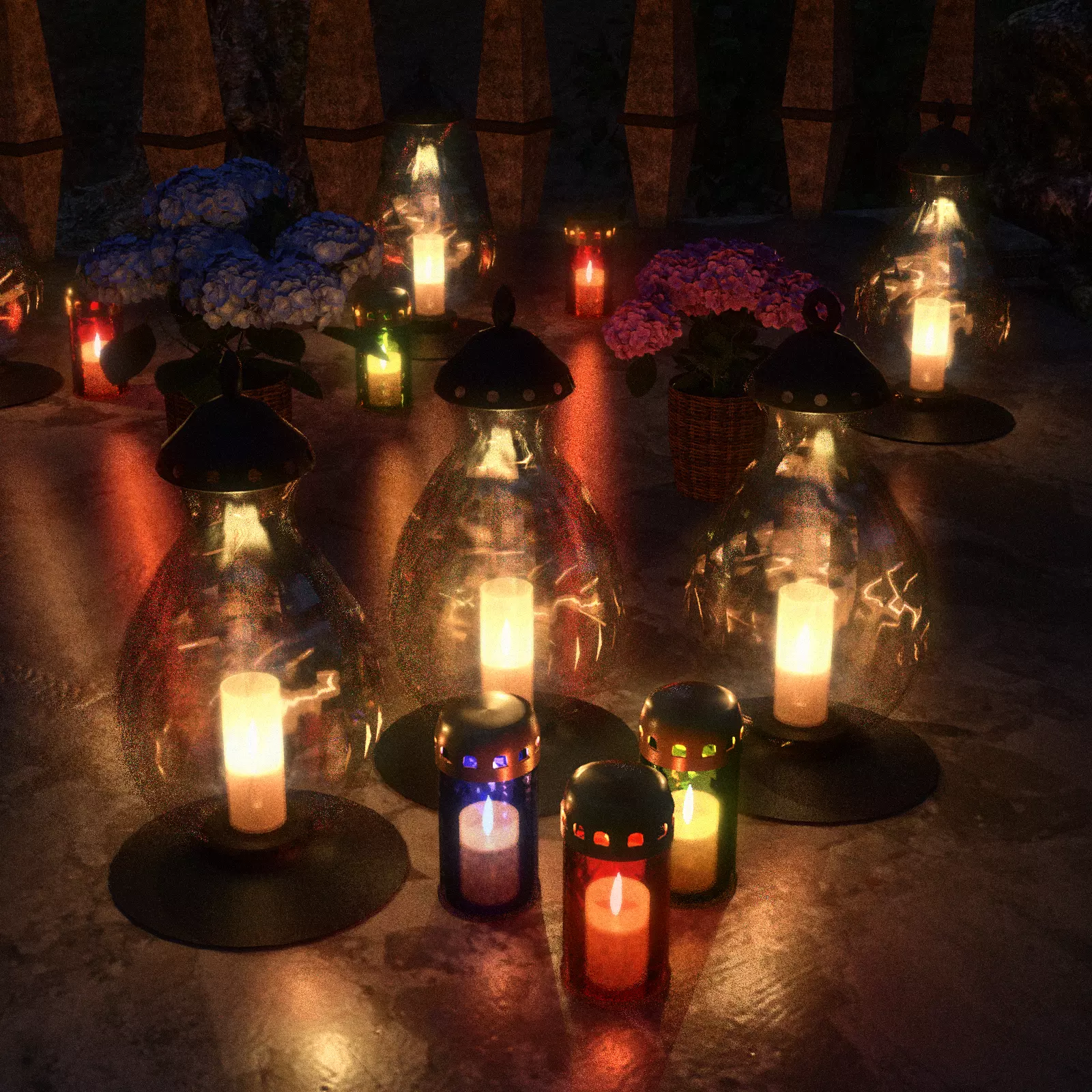 These lanterns capture the authentic atmosphere of European cemeteries – quiet alleys, stone paths, and rows of glowing candles. Perfect for adding a hauntingly beautiful touch to your Halloween scenes. Combine them with flowers, fog, or gothic environments to create that unmistakable, spine-tingling ambience.Bring a touch of atmosphere to your scenes with this set of traditional glass and metal candle lanterns.Whether you need a soft nostalgic glow, a mysterious Halloween mood, or a realistic cemetery setting – these lanterns deliver authentic light and reflections.