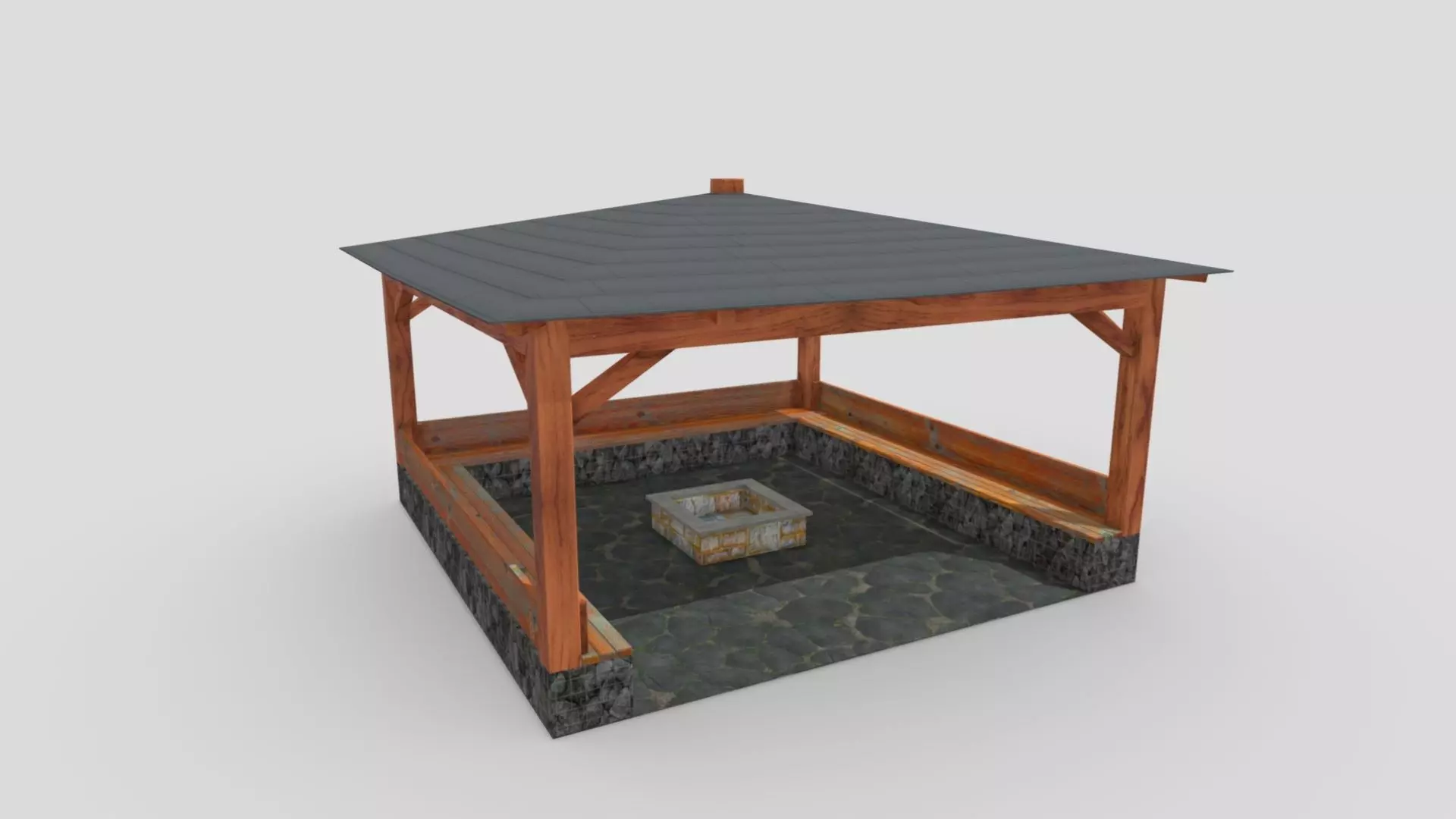 A large wooden gazebo with a dark pitched roof, supported by thick timber beams. The structure features built-in wooden seating along the inner sides and is enclosed by low stone walls. In the center, there is a square stone fire pit placed on a textured stone floor, creating a cozy and rustic outdoor atmosphere.