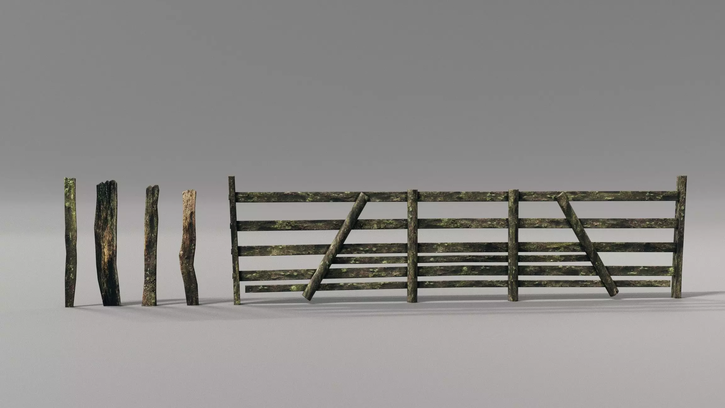all models share a baked PBR material with textures from real wood fences. all textures are packed into the .blend files and can be downloaded manually for the.fbx and .obj formats.