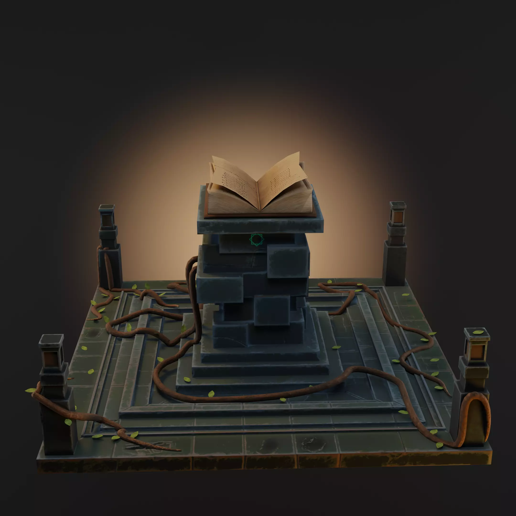 The asset includes the altar base, ancient book, stone pillars, roots, vines, and decorative elements, all optimized into a single cohesive scene — ideal for game levels, cinematics, or environment set-dressing.